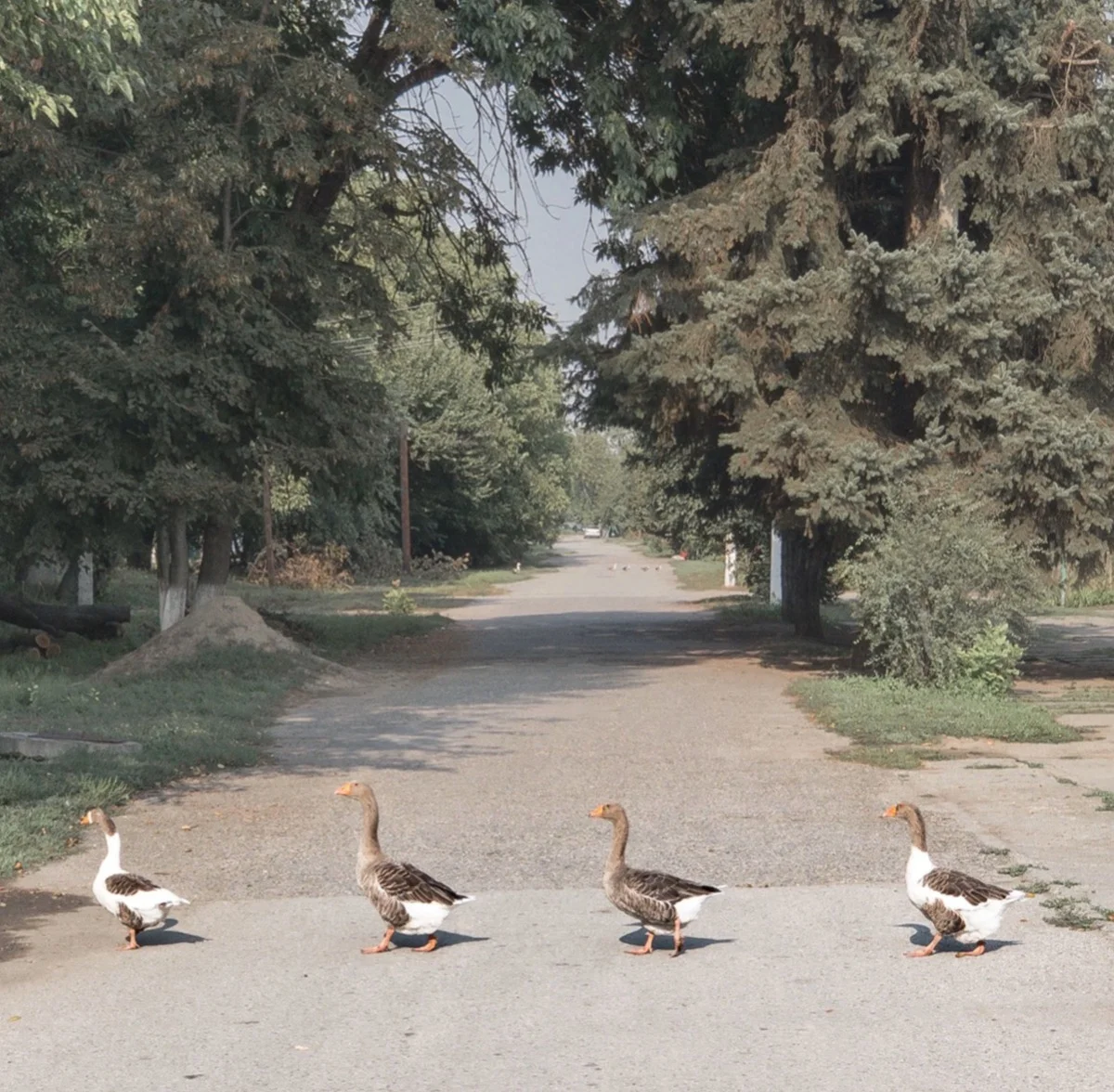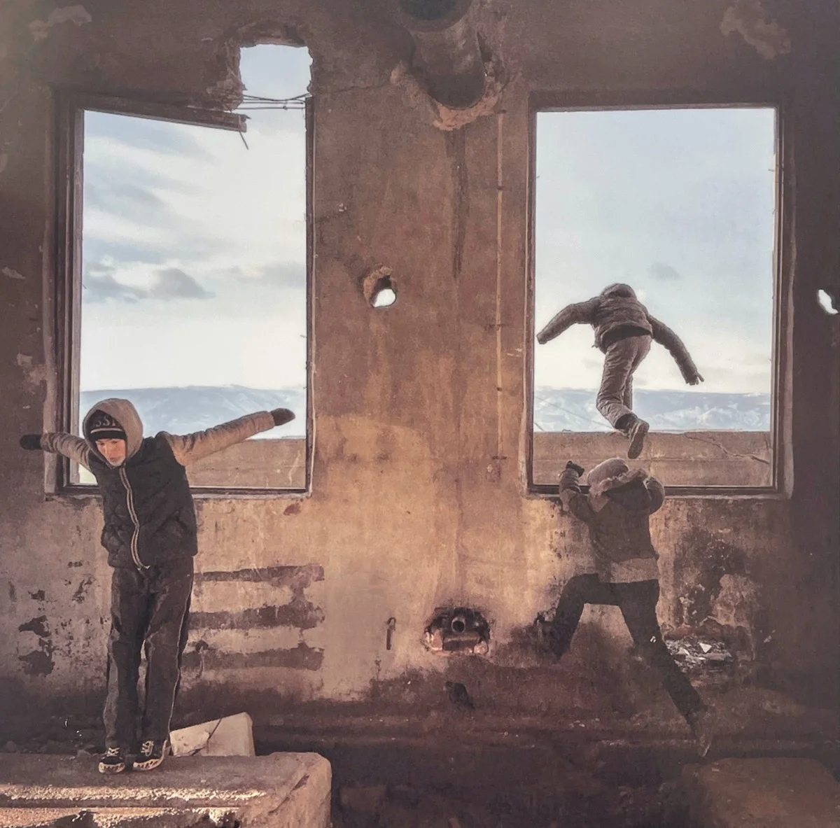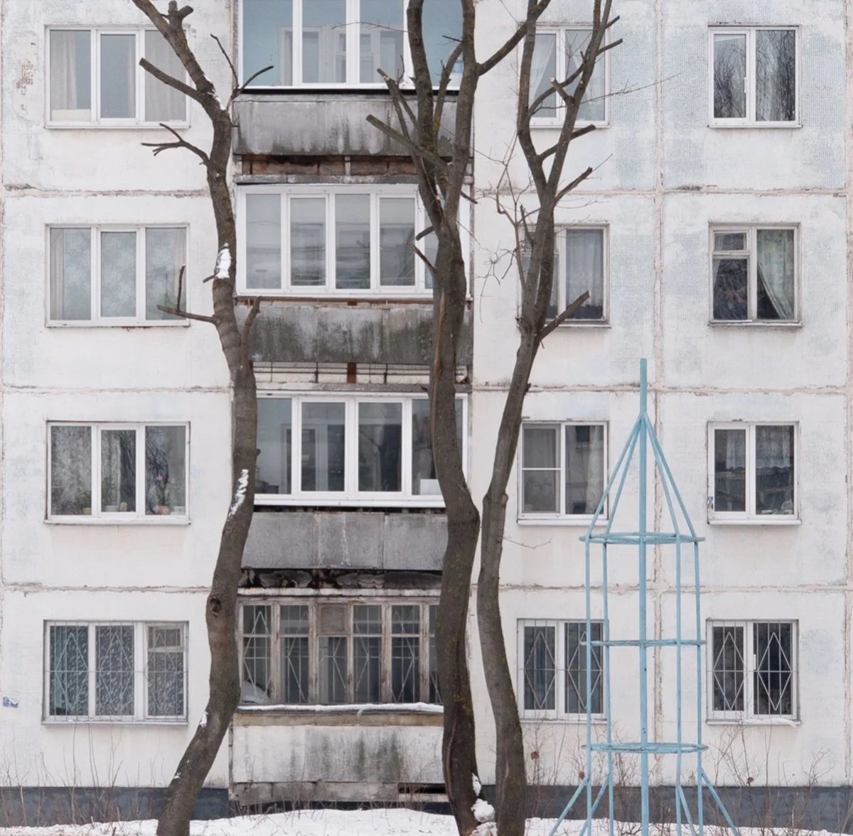 Путешествие с фотографиями Дмитрия Маркова начинается с привычных уличных зарисовок: облупленные многоэтажки, во дворе вместо игровой детской площадки — обрезки бетонных труб, по которым лазают дети. И снова многоэтажный дом, безрадостный и тоскливый, серый снег на газонах, но во дворе, на переднем плане — яркий снеговик, украшенный к новогодним праздникам. Кадр выстроен так, что веселый снеговик почти перекрывает серый дом и серый снег, уводя внимание от них и обращая его к празднику. Таких дворов и домов — миллионы по всей стране, и совсем неважно, где сделаны эти снимки.