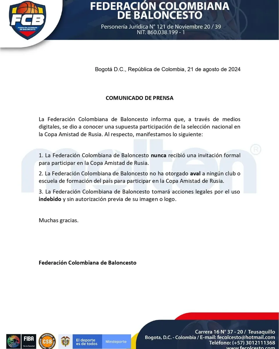 В Федерации баскетбола Колумбии сказали, что не получали никакого приглашения для участия в Кубке дружбы в России, а также не давали никому разрешение выступать за сборную.