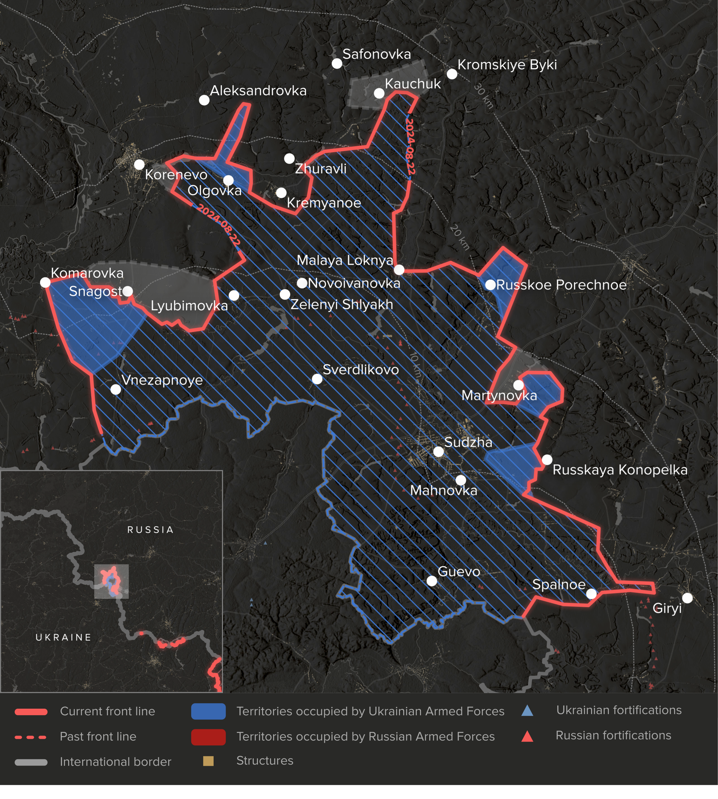 Northeast of Korenevo, Ukrainian forces were unable to hold the area around the settlement of Kauchuk or advance through difficult terrain toward the settlement of Kromskiye Byki on the Sudzha-Lgov highway. The highway itself is blocked by Russian forces to the south, near Malaya Loknya, where heavy fighting is ongoing.