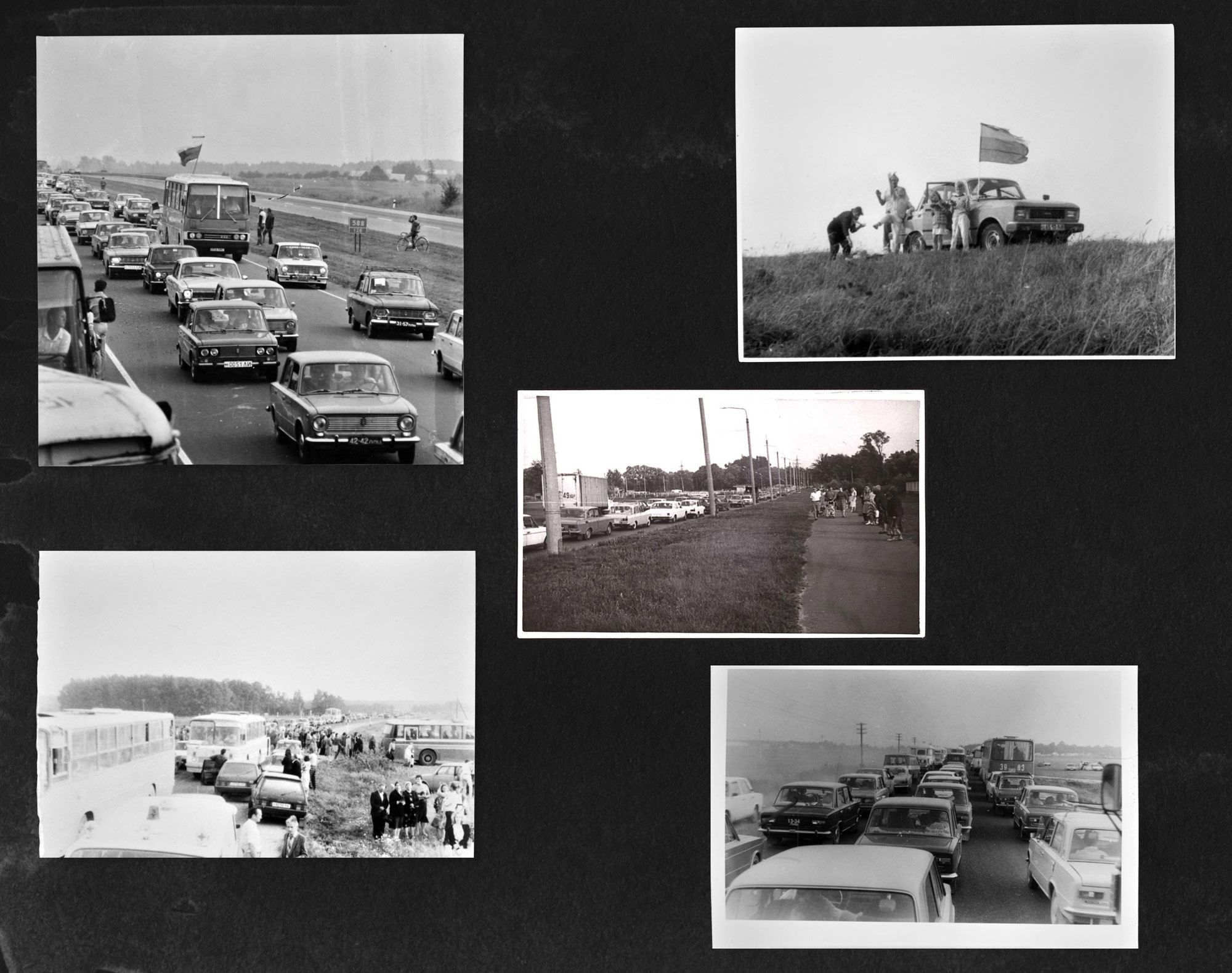 Автомобили и автобусы едут на намеченные участки акции «Балтийский путь». 17-й километр трассы Вильнюс—Паневежис. Литва, 23 августа 1989 года