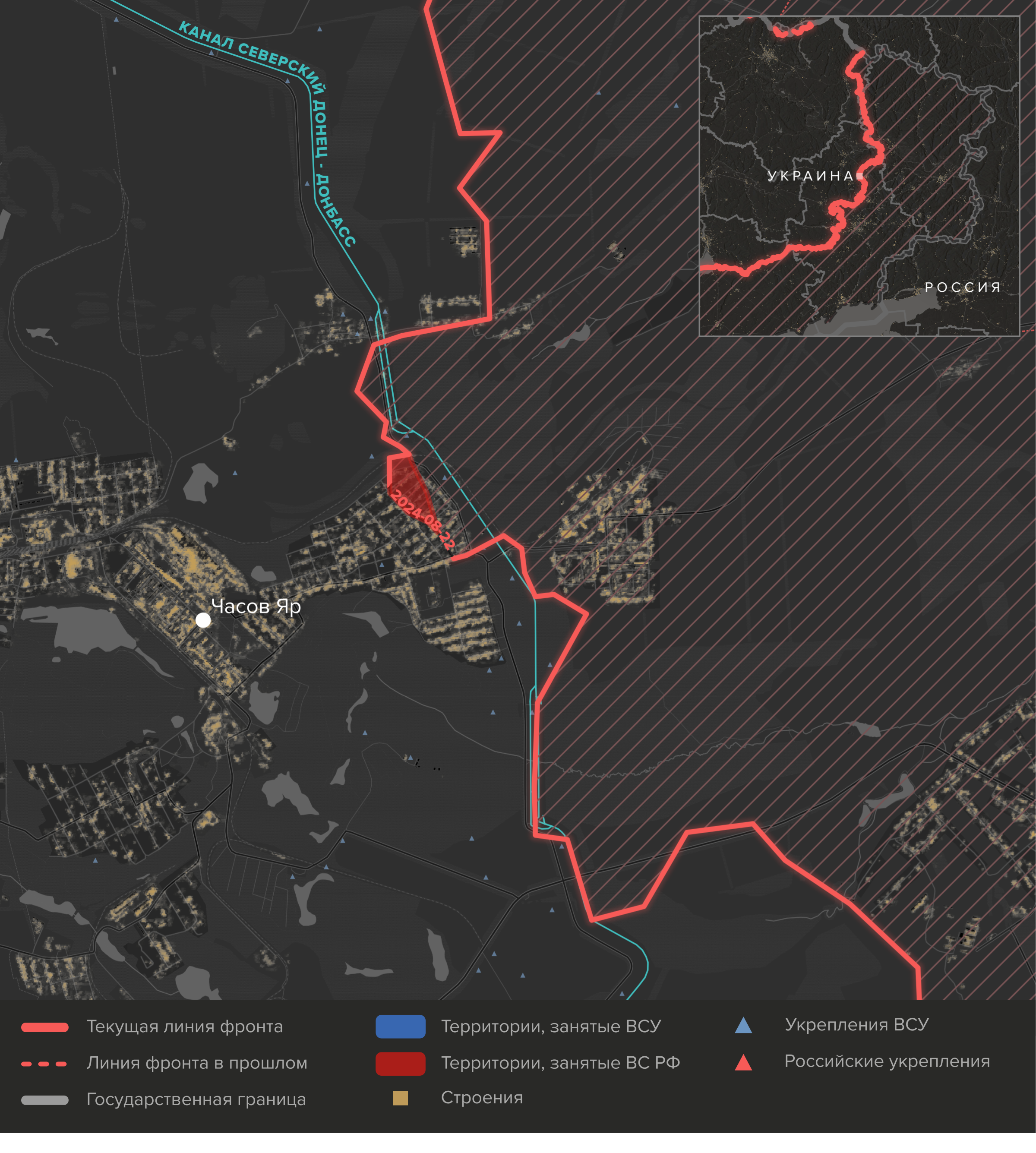 - То, что направление Часова Яра стало «донором» резервов для Курского и других фронтов, может свидетельствовать об относительно низком его приоритете для российского командования — по крайней мере до тех пор, пока не будет захвачен соседний Торецк. Однако это не мешает 98-й воздушно-десантной дивизии и приданным ей частям продолжать штурм Часова Яра «в лоб». Российским войскам удалось расширить плацдарм на западном берегу канала Северский Донец — Донбасс в черте города. Таким же образом — с помощью постепенного накопления сил в жилой застройке с последующим решительным штурмом — ВС РФ весной — в начале лета захватили микрорайон Часова Яра к востоку от канала.