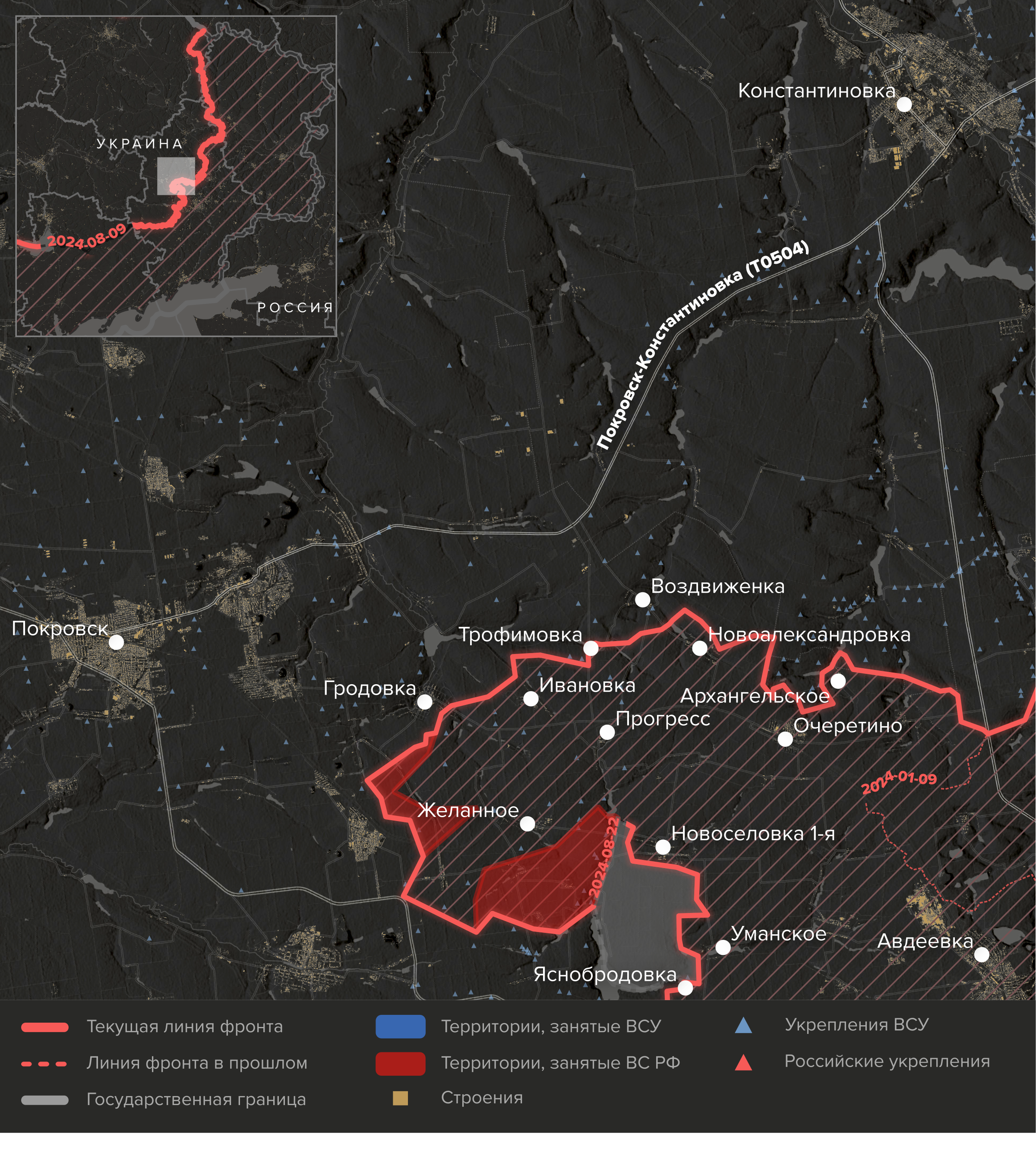 - 22 августа российские войска начали штурм города Новогродовки — последнего перед Селидово. Кроме того, они пытаются обойти Новогродовку с востока.