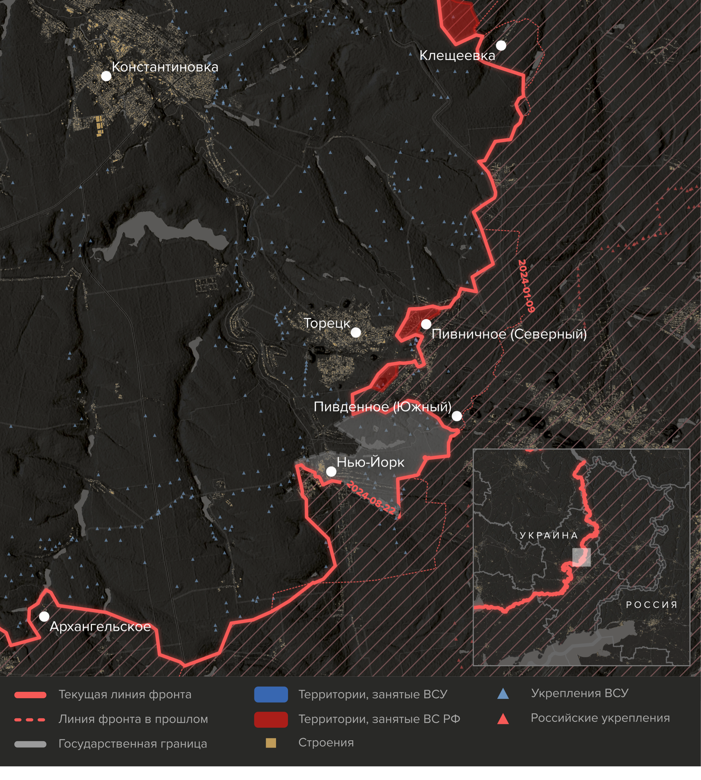 Украинское наступление в Курской области продолжается, несмотря на прибытие в район боевых действий российских резервов. ВСУ пытаются расширить плацдарм вдоль границы и одновременно прорваться вглубь территории РФ. В то же время ВС РФ совершили прорывы украинской обороны в Донецкой области — к югу от Покровска и в Торецкой агломерации. Российское наступление не только не остановилось после атаки ВСУ в Курской области, но даже существенно ускорилось.