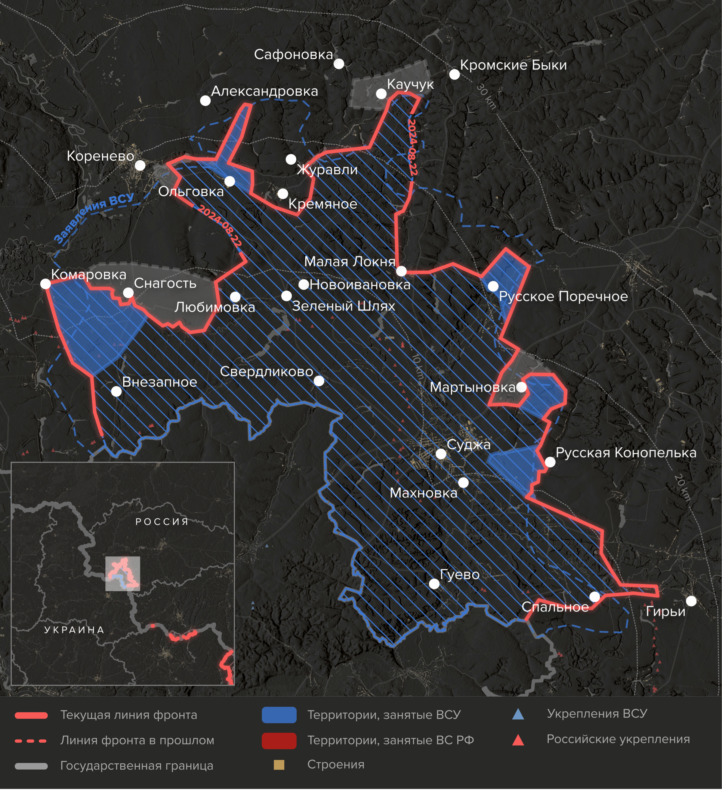 - Наконец, южнее Русской Конопельки попытки ВСУ расширить плацдарм вдоль границы на восток от Суджи успехом не увенчались. Подошедшие в тот район российские резервы (например, в Русской Конопельке действует по крайней мере одно подразделение 11-й десантно-штурмовой бригады (ДШБ) из Улан-Удэ; весной она участвовала в штурме Часова Яра) остановили украинский прорыв в нескольких километрах от Суджи. ВС РФ пытаются контратаковать позиции ВСУ в Борках и селе Спальном.