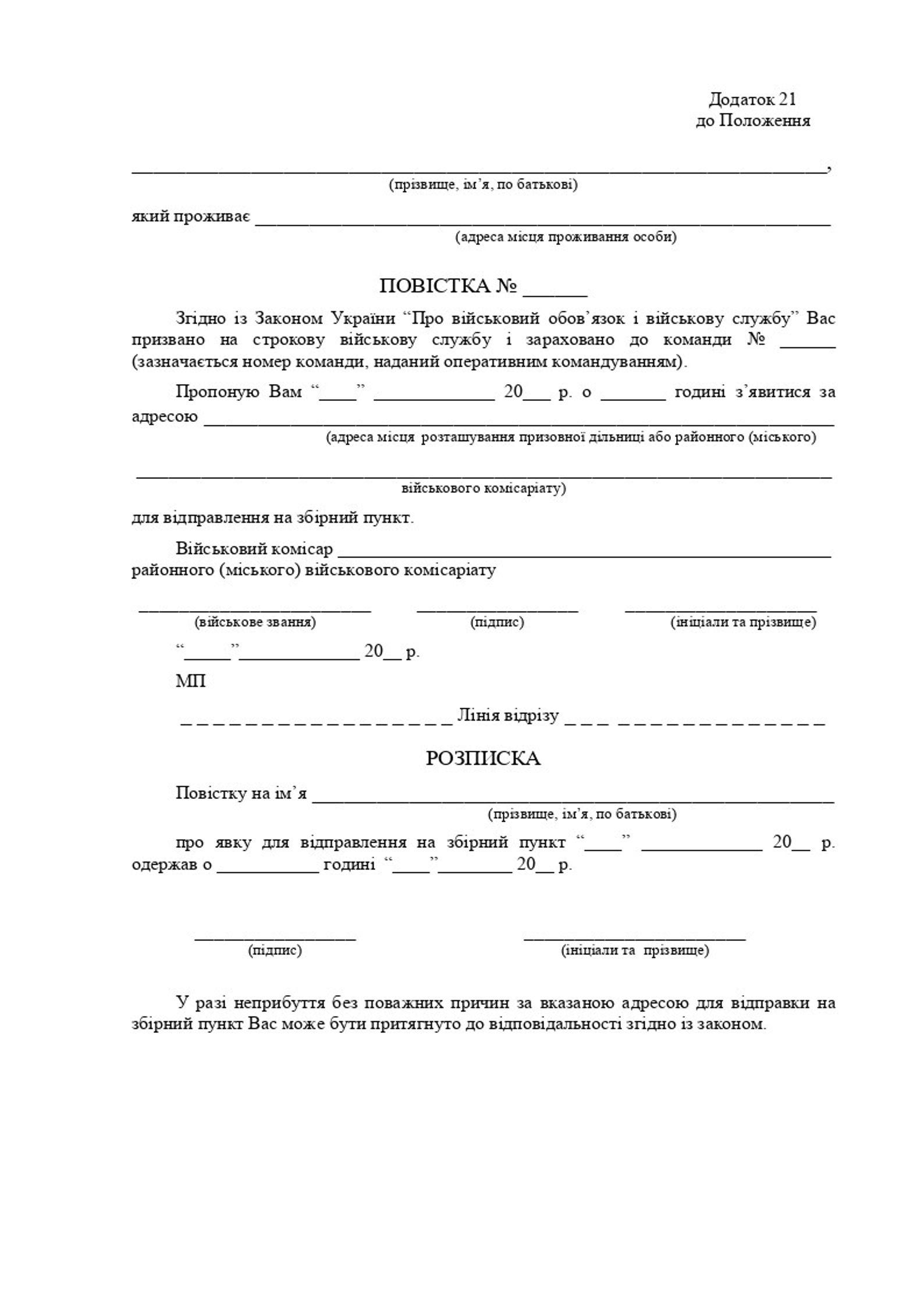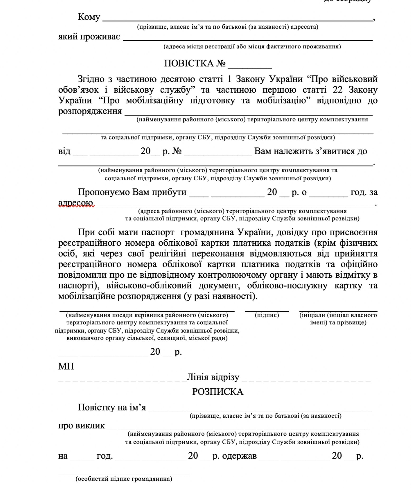А вот сама повестка выглядит несколько странно. В ней верно указаны адрес ТЦК и имя его начальника, а на печати правильный идентификационный код учреждения. Но утвержденной в 2023 году форме она не соответствует