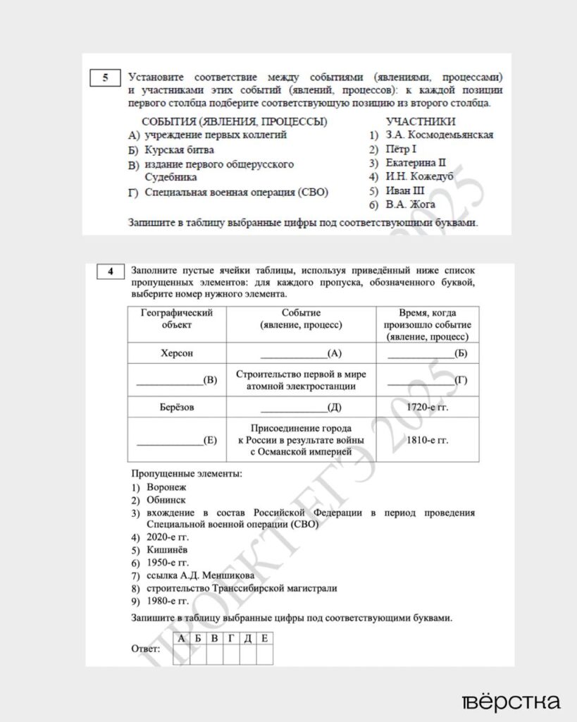 Вопросы о войне в Украине и аннексированных территориях уже появлялись в ЕГЭ по истории в прошлом году, писала «Вёрстка». Тогда в одном из вопросов предлагали расположить в хронологическом порядке подписание «договоров о принятии ДНР, ЛНР, Запорожской и Херсонской областей в состав России», запуск первой в мире атомной электростанции и кругосветное путешествие Магеллана. В другом задании 11-классников просят соотнести Ледовое побоище, СВО, Полтавскую и Московскую битвы с участниками этих событий.