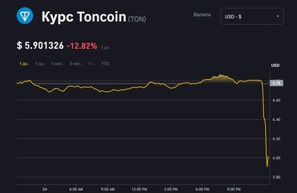 Тем временем криптовалюта TON отреагировала на новость о задержании Дурова падением на 12%