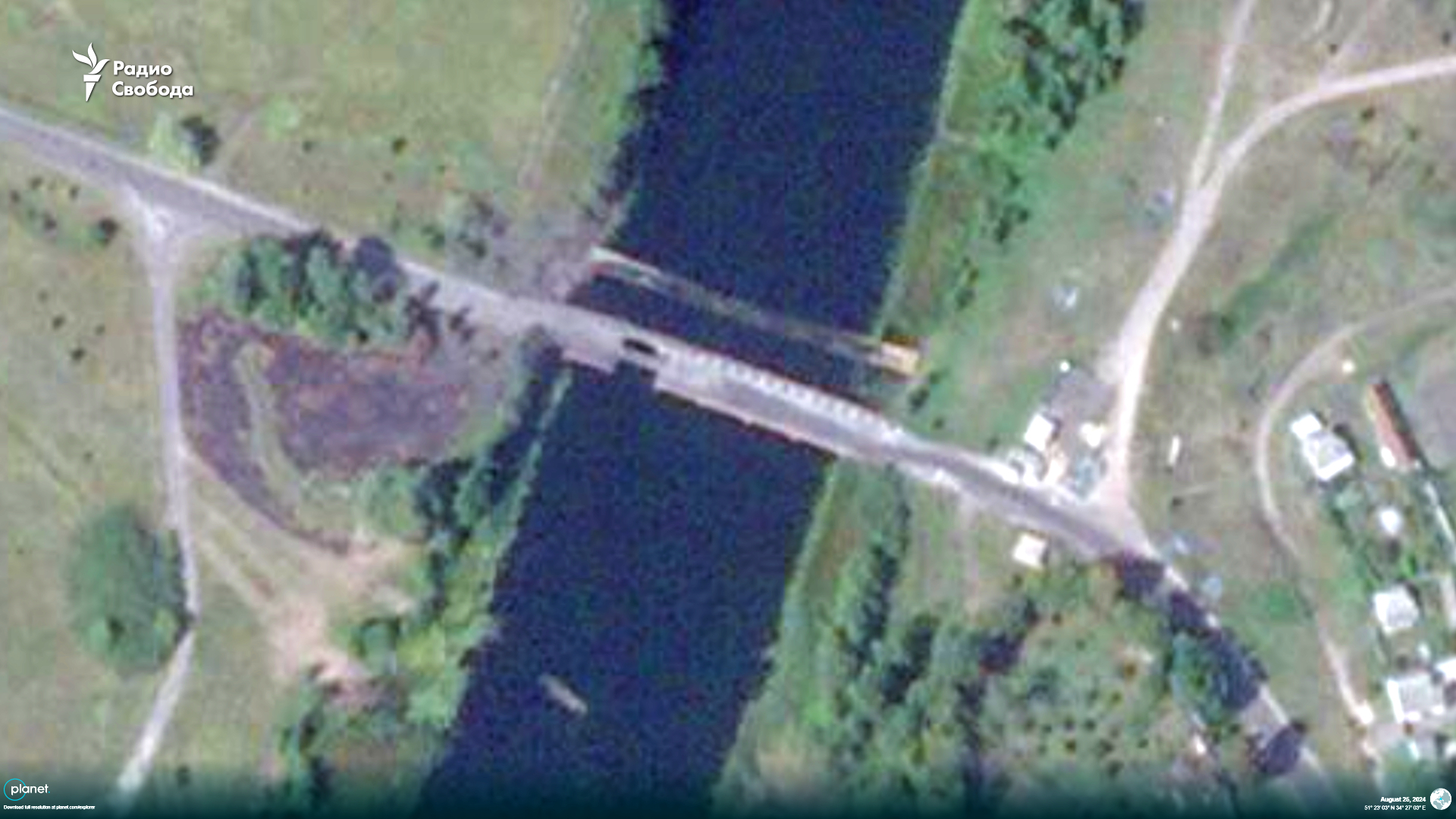 Новый спутниковый снимок, сделанный в воскресенье, 25 августа, показывает, что мост через реку Сейм в Глушковском районе Курской области в селе Карыж практически непригоден для проезда тяжелой техники после новых ударов украинской армии. Вместе с этим на фотографии можно увидеть, что российские военные соорудили рядом с ним временную понтонную, а также лодочную переправу.