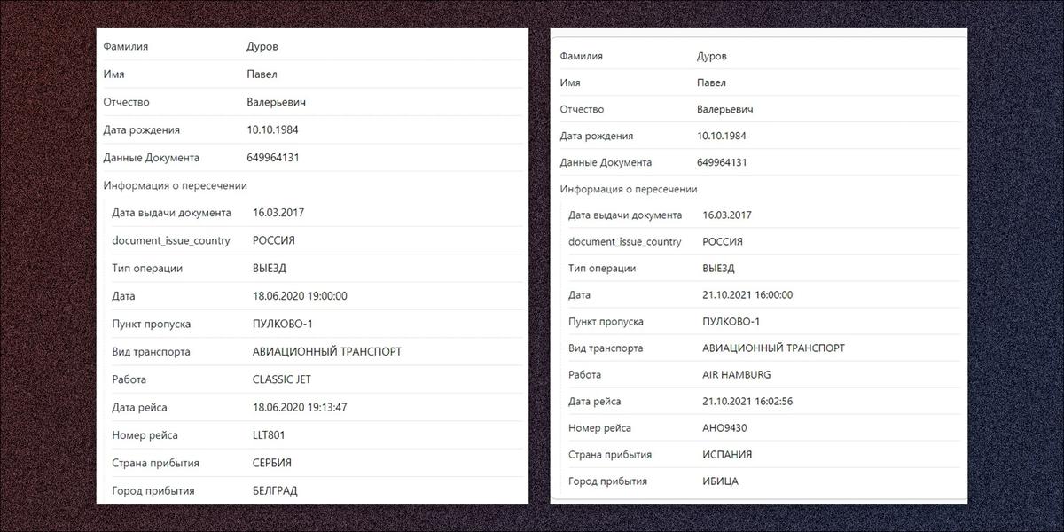 That's when Durov arrived in Russia for the first time since December 2017. The date of the border crossing is not shown in the FSB databases, but it is safe to say that Durov was in St. Petersburg on June 18, 2020 - on the evening of that day he boarded a plane from Pulkovo to Belgrade.