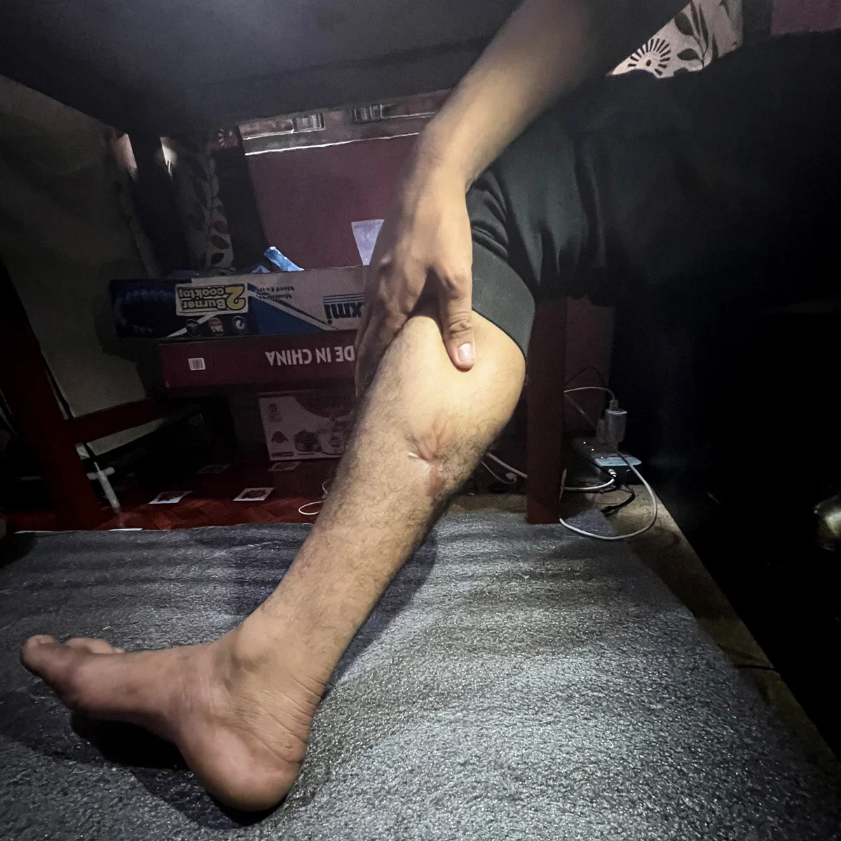 Prakash meets me at a bus stop and takes me for a long walk back to his home — a rented room on the outskirts of Kathmandu. He is wearing black sweatpants and a blue sports jumper. He limps heavily on his right leg and speaks quietly, barely moving his lips.