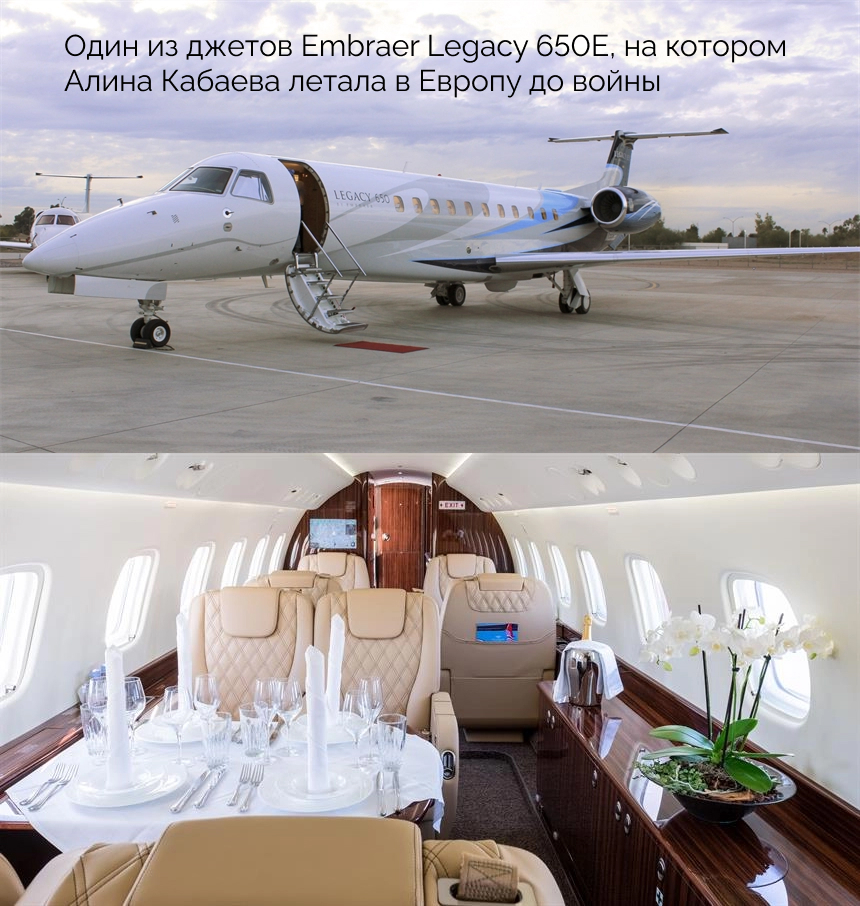 - Почти во всех случаях Кабаева пользовалась услугами частных авиакомпаний. Чаще других — шесть раз — она летала на Embraer Legacy 650, стоимость часа аренды такого борта составляет около 5,5 тысячи евро. Еще по три раза пользовалась Bombardier Challenger 300 (4,5 тысячи евро в час), Mitsubishi Challenger 850 (5,4 тысячи) и Bombardier Global 5000 (6,5 тысячи). Мы привели актуальные цены с сайта авиаброкера JETVIP.