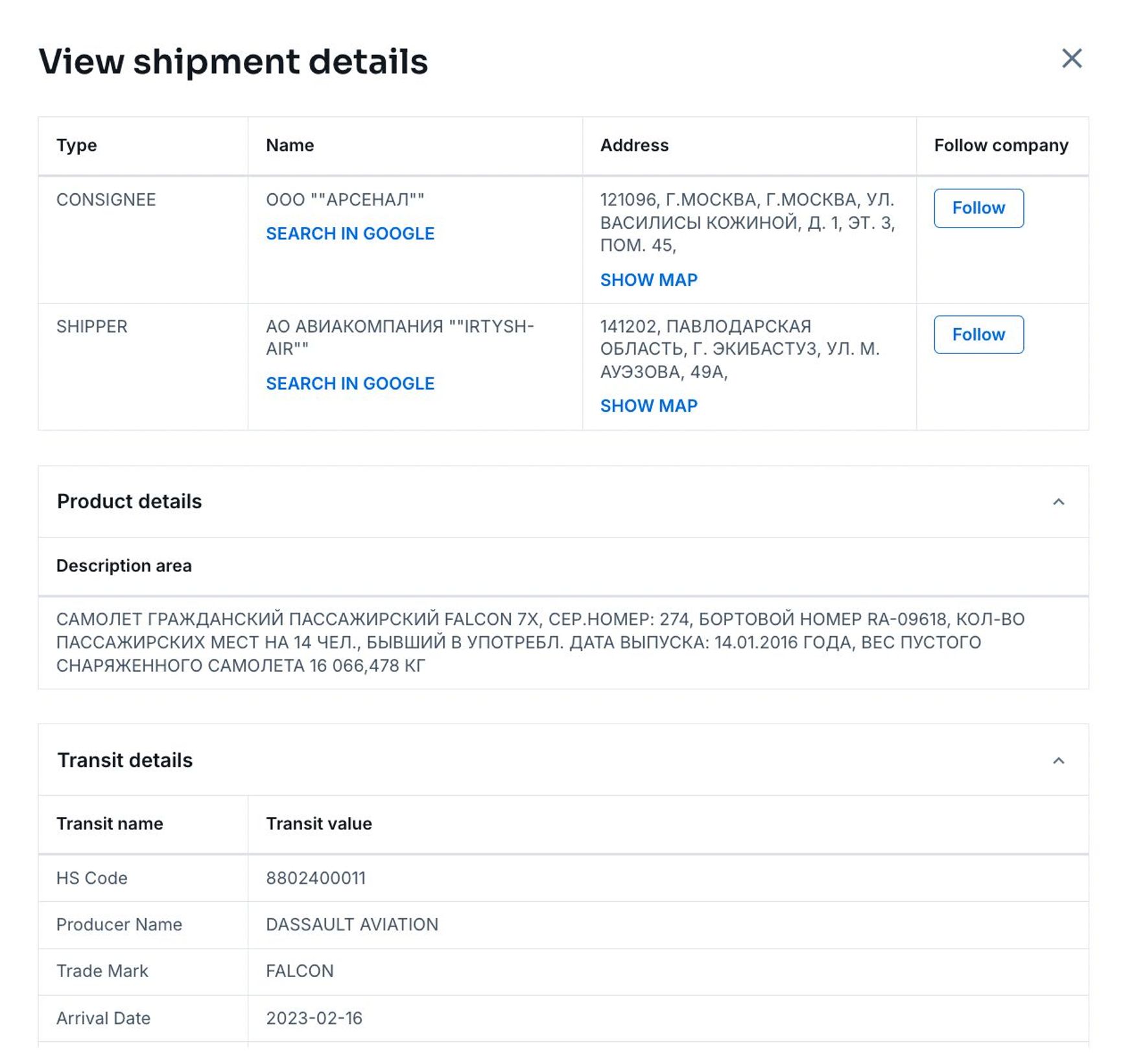 According to data obtained by The Insider, Arsenal's nominal registered owner has a subsidiary in China — Beijing Jinsennade Trading. This company imports goods for Rusal's facilities, further linking Arsenal — and by extension, the plane — to Deripaska, as corroborated by the matching travel schedules of the oligarch and the jet.