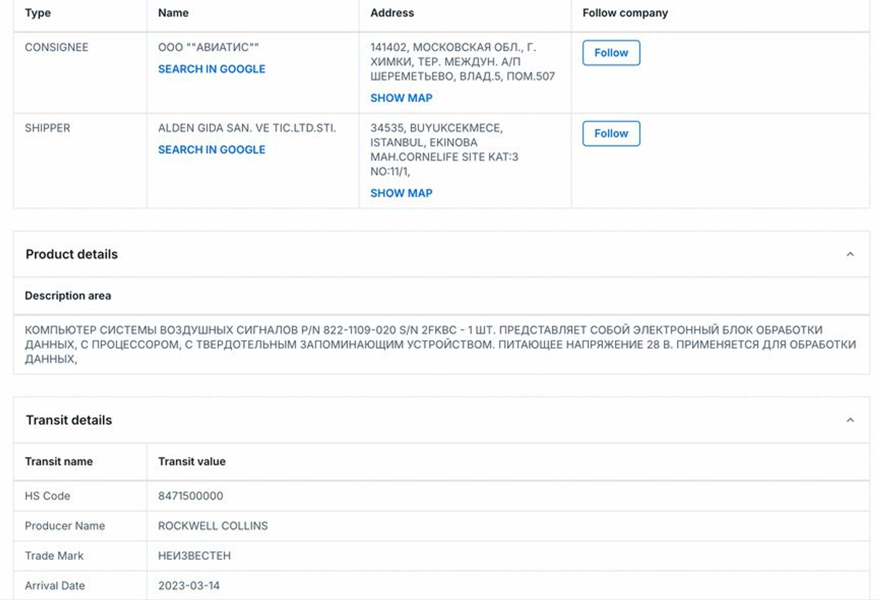 Customs records show that Aviatis also circumvents sanctions in order to import spare parts, including an American-made tire for the nose section of landing gear, shipped from Turkey by Alden Gida San Ve Tic Ltd. Last year, the Turkish company also provided the oligarch with an air data computer manufactured by the U.S. firm Rockwell Collins for his Bombardier Challenger 300.