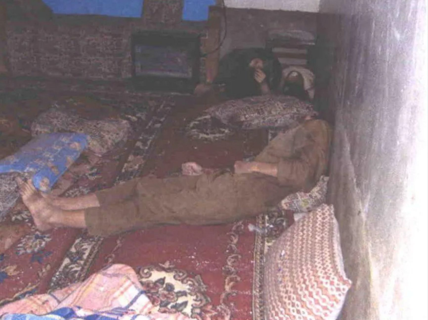 Гостиная, где морские пехотинцы убили Асмаа, ее сына Абдуллу и двух других членов семьи. Тело 43-летнего Джахида Абдул Хамида Хасана лежит у стены на переднем плане. Военный судмедэксперт пришел к выводу, что Джахид, вероятно, лежал или сидел у стены, когда в него стреляли. Позади него, в углу комнаты, лежат тела Асмаа и Абдуллы. Морские пехотинцы сделали это фото после того, как перенесли тело Абдуллы, поэтому рука его матери больше не лежит на его спине.