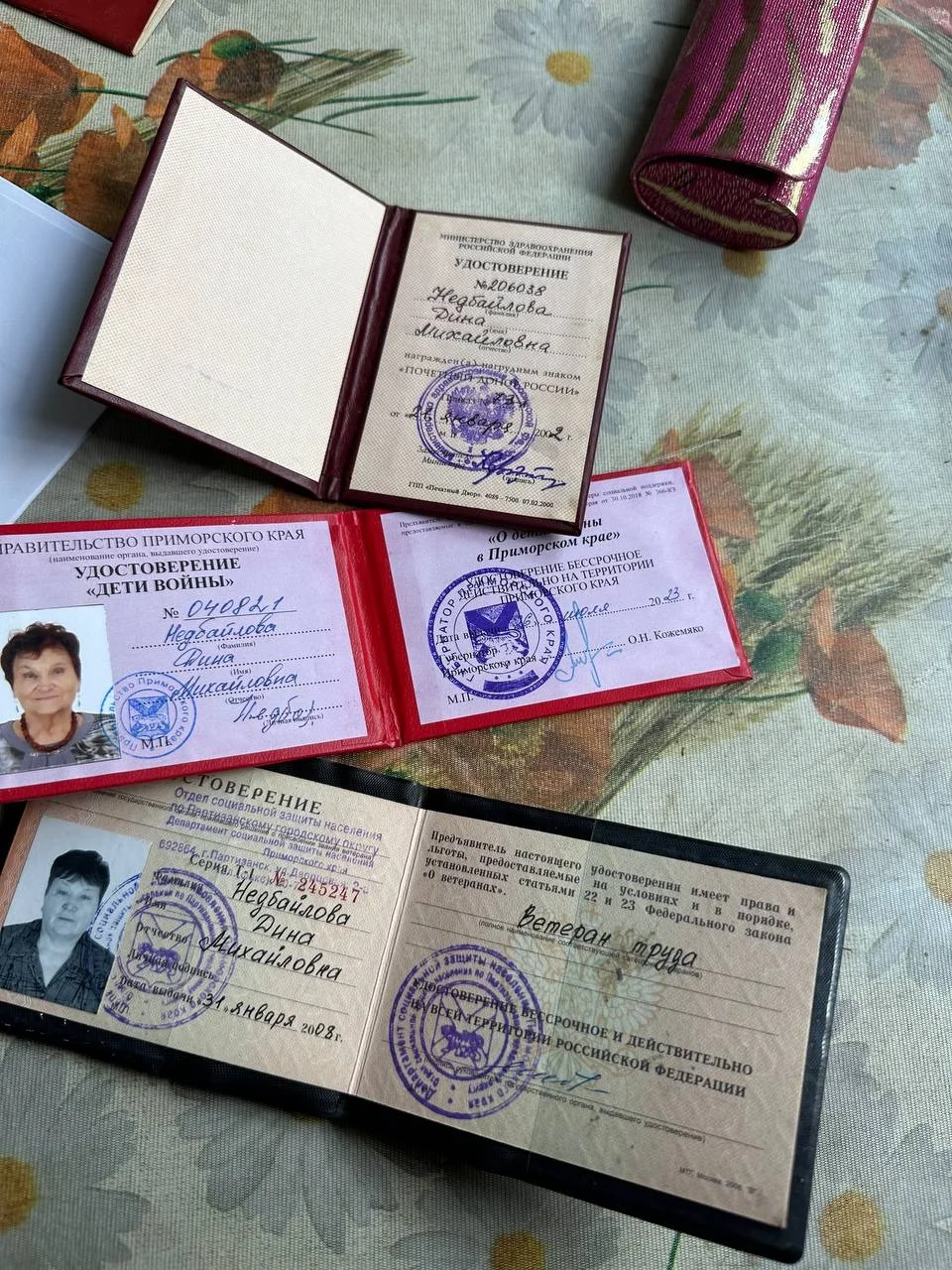 Дине Недбайловой 79 лет. Она выкладывает на стол свои удостоверения — «Дитё войны», «Почетный донор», «Ветеран труда». Еще она инвалид, по заболеванию крови.