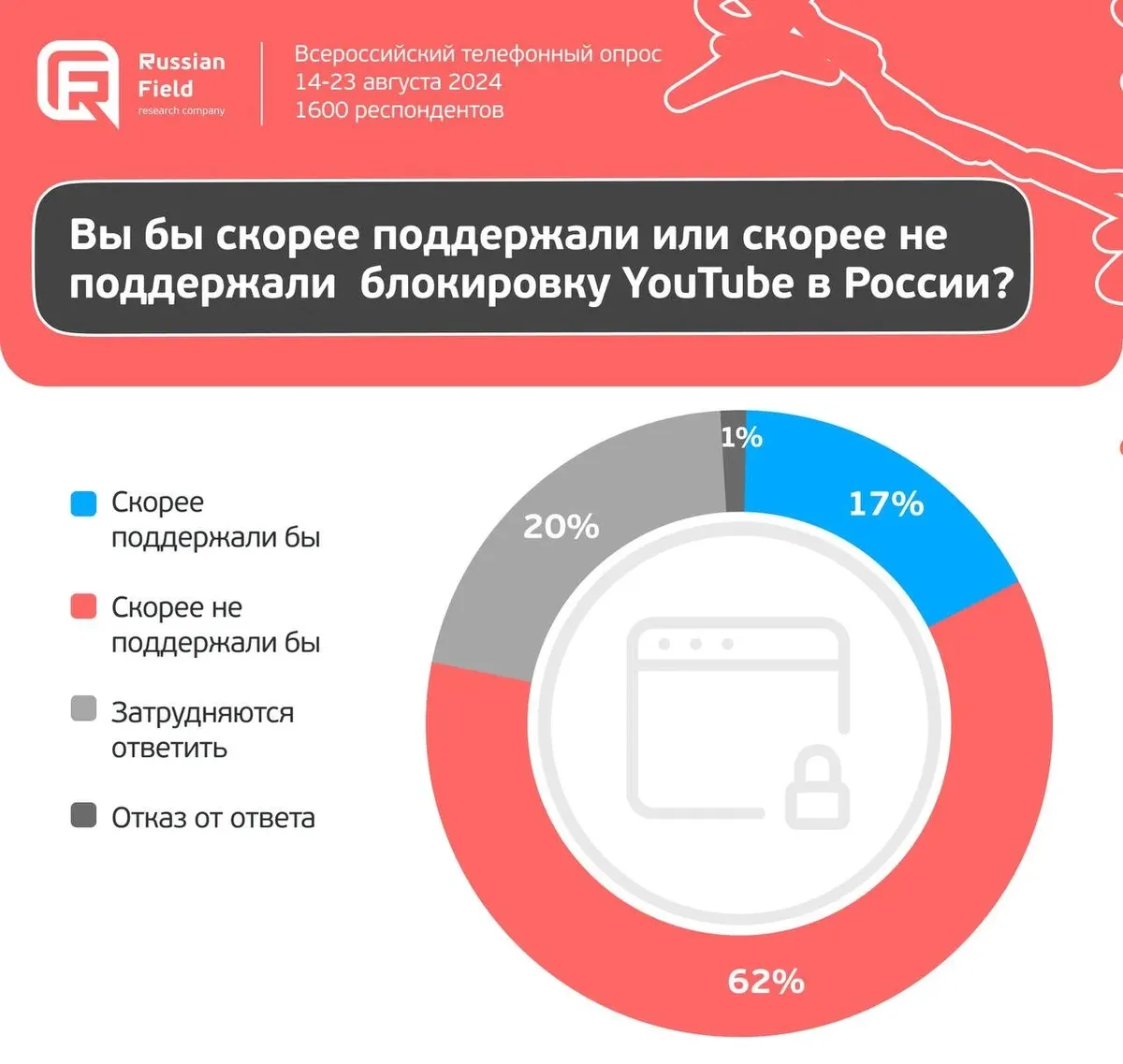По результатам свежего телефонного соцопроса россиян, подавляющее большинство их не поддерживают «замедление» Youtube Роскомнадзором. В опросе поучаствовали 1600 респондентов, ответы принимались с 14-23 августа, детализирует социологический проект Russian Field. По его данным, 17% россиян поддерживают «замедление» сервиса, и еще 20% пока еще не определились…