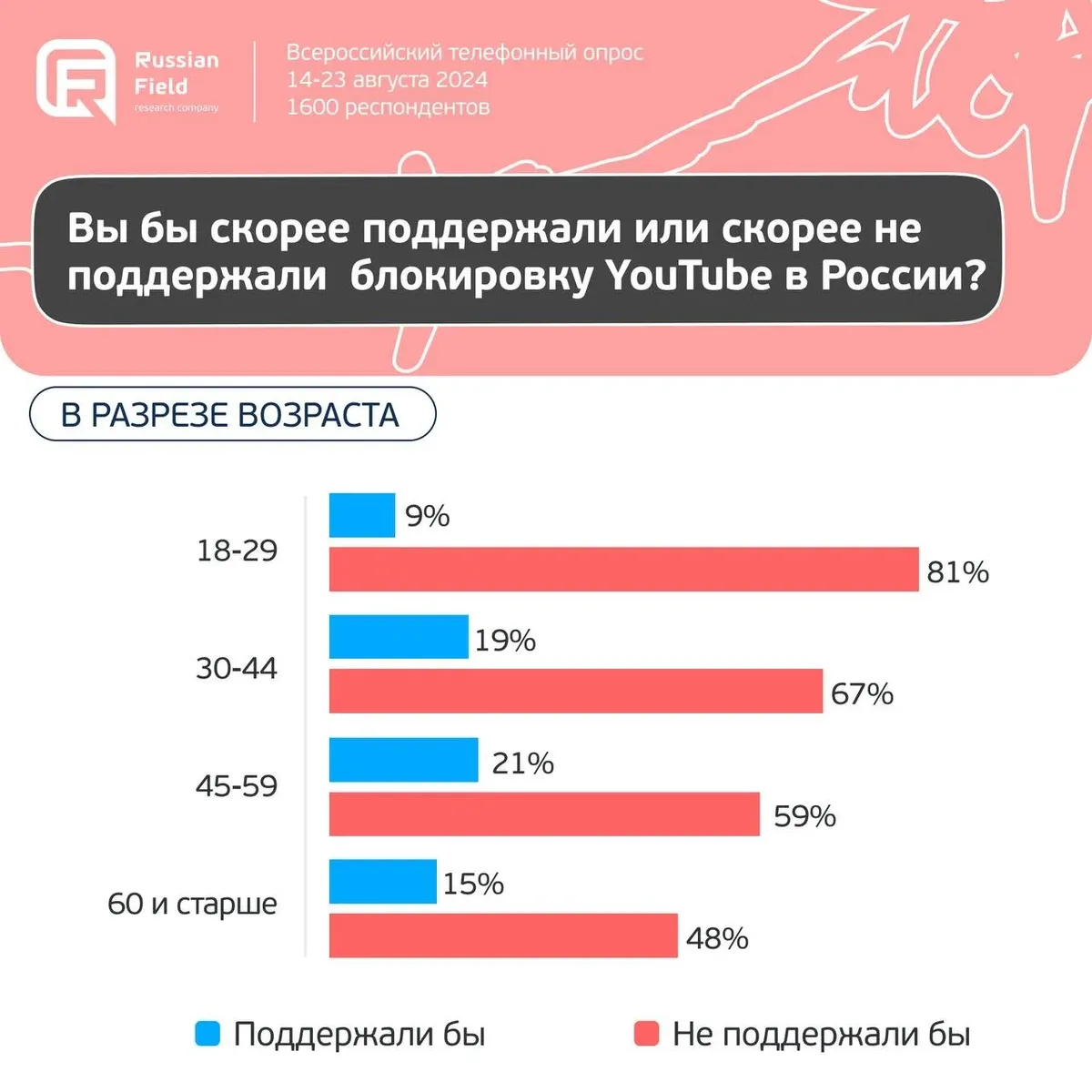 Еще интереснее реакция россиян на фактически блокировку Youtube , распределенная по возрасту.