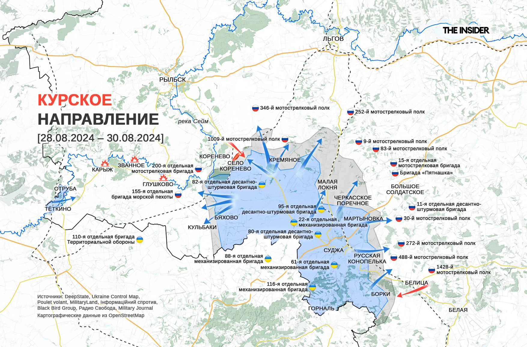 Минобороны РФ отчитывается о боях в Курской области около Малой Локни, Пушкарного, Русской Конопельки, Кремяного, Черкасского Поречного. Сводка ведомства примечательна исчезновением фразы «операция по уничтожению формирований ВСУ продолжается», которой неизменно заканчивались предыдущие сообщения о боевых действиях в регионе. Между тем об успехах ВС РФ на курском направлении сообщает DeepState. По данным аналитиков проекта, российским войскам удалось занять село Коренево, расположенное рядом с одноименным райцентром.