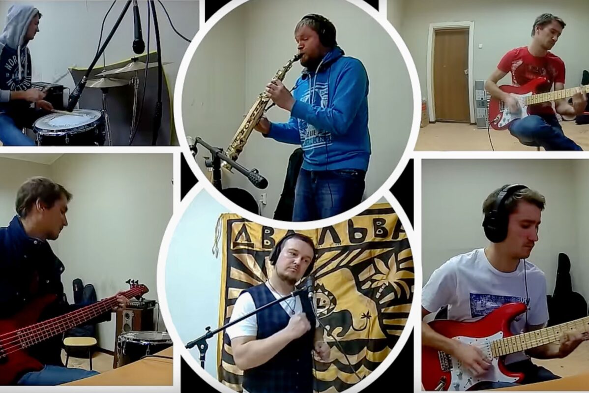 Андрей Шабанов (сверху в центре) играет вместе с другими музыкантами кавер песни группы Аквариум, 2016 год. Скриншот видео с Youtube-канала «Иван Барабан».