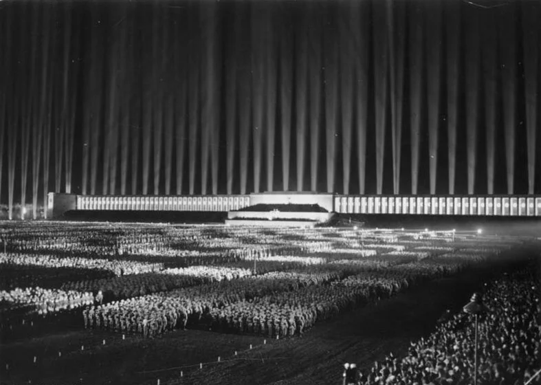 Шпеер умел угадывать и воплощать эти грезы в бетоне — например, в гигантском здании новой рейхсканцелярии или в комплексе, возведенном для партийных съездов в Нюрнберге.