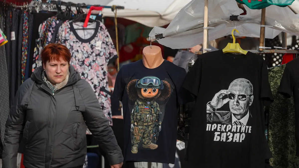 A woman walks past a stall selling “patriotic” shirts, including one with a portrait of Vladimir Putin and the slogan “Stop talking” in the Tula region town of Yefremov, Russia, 6 April 2023. Photo: EPA-EFE / MAXIM SHIPENKOV