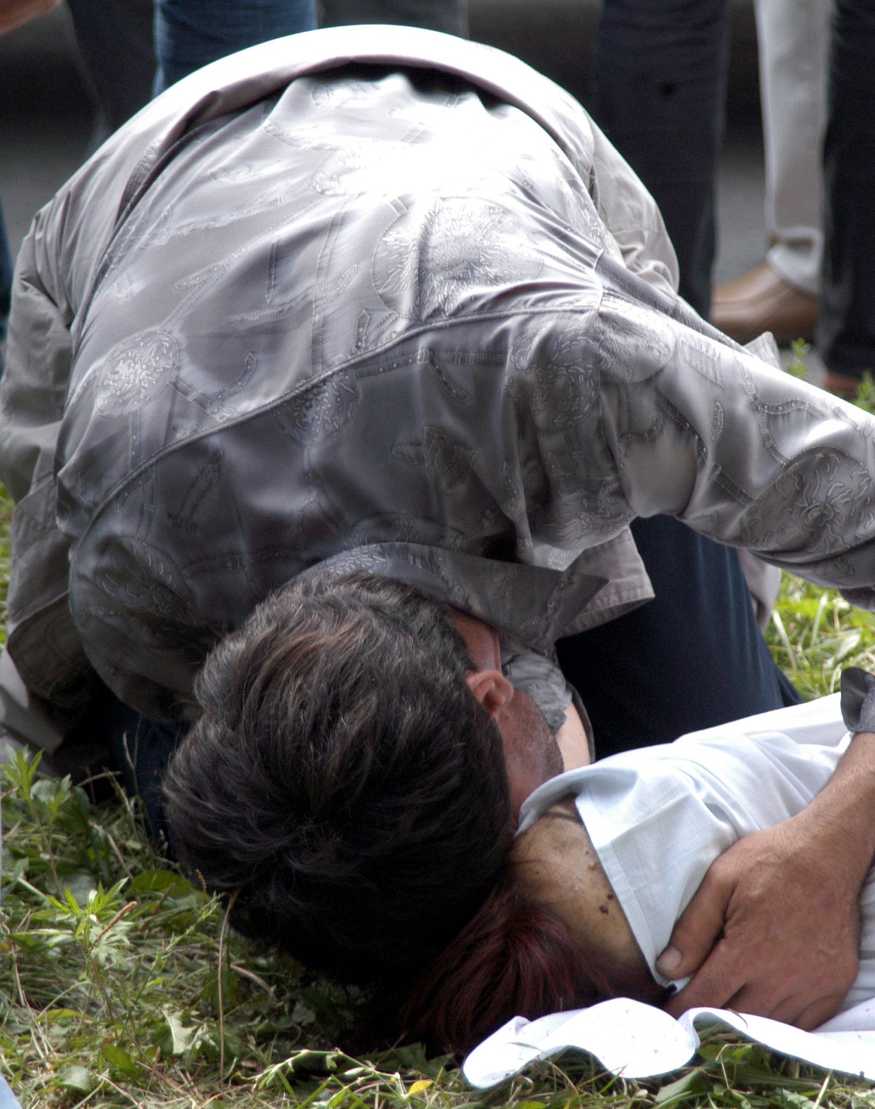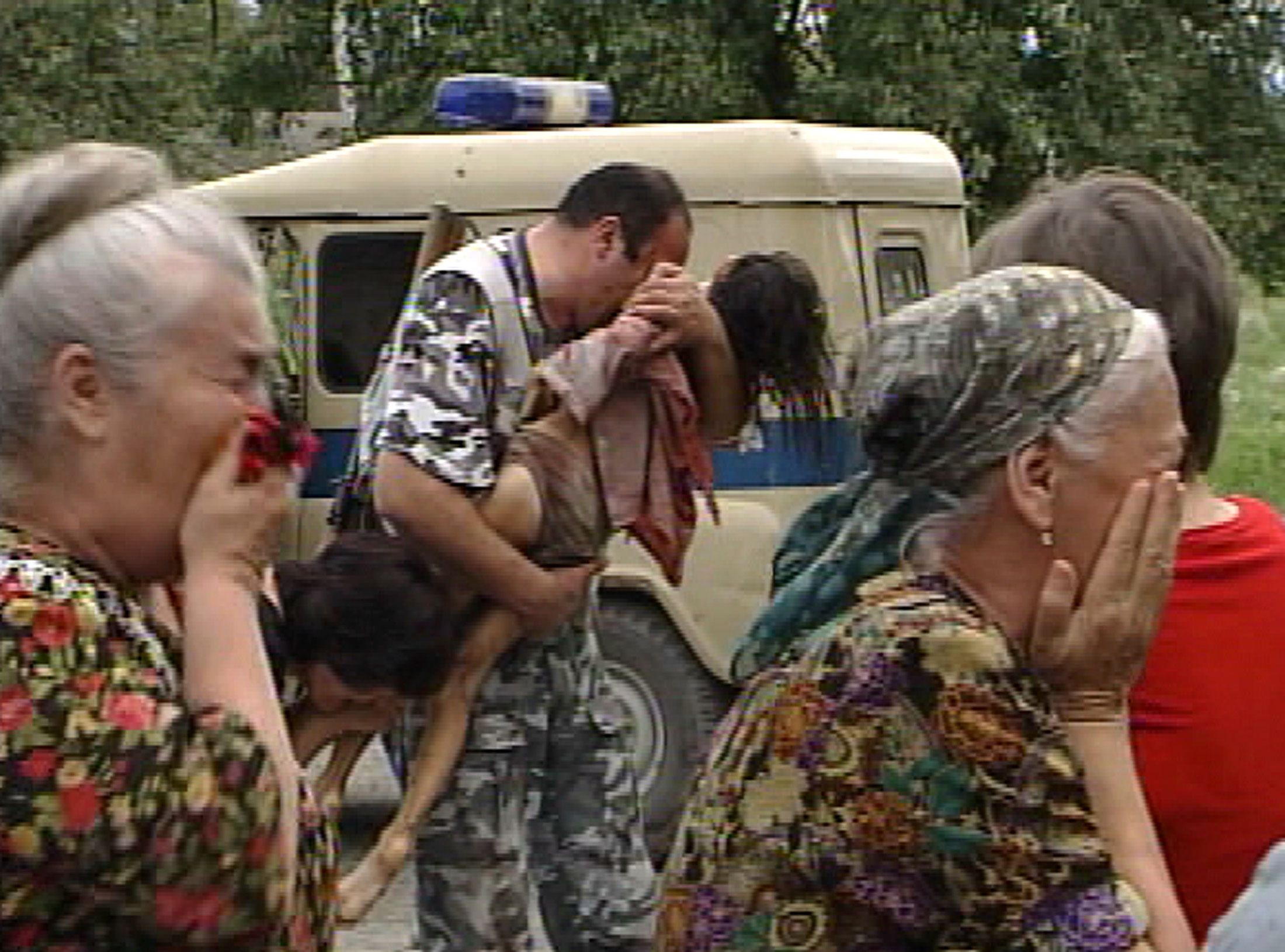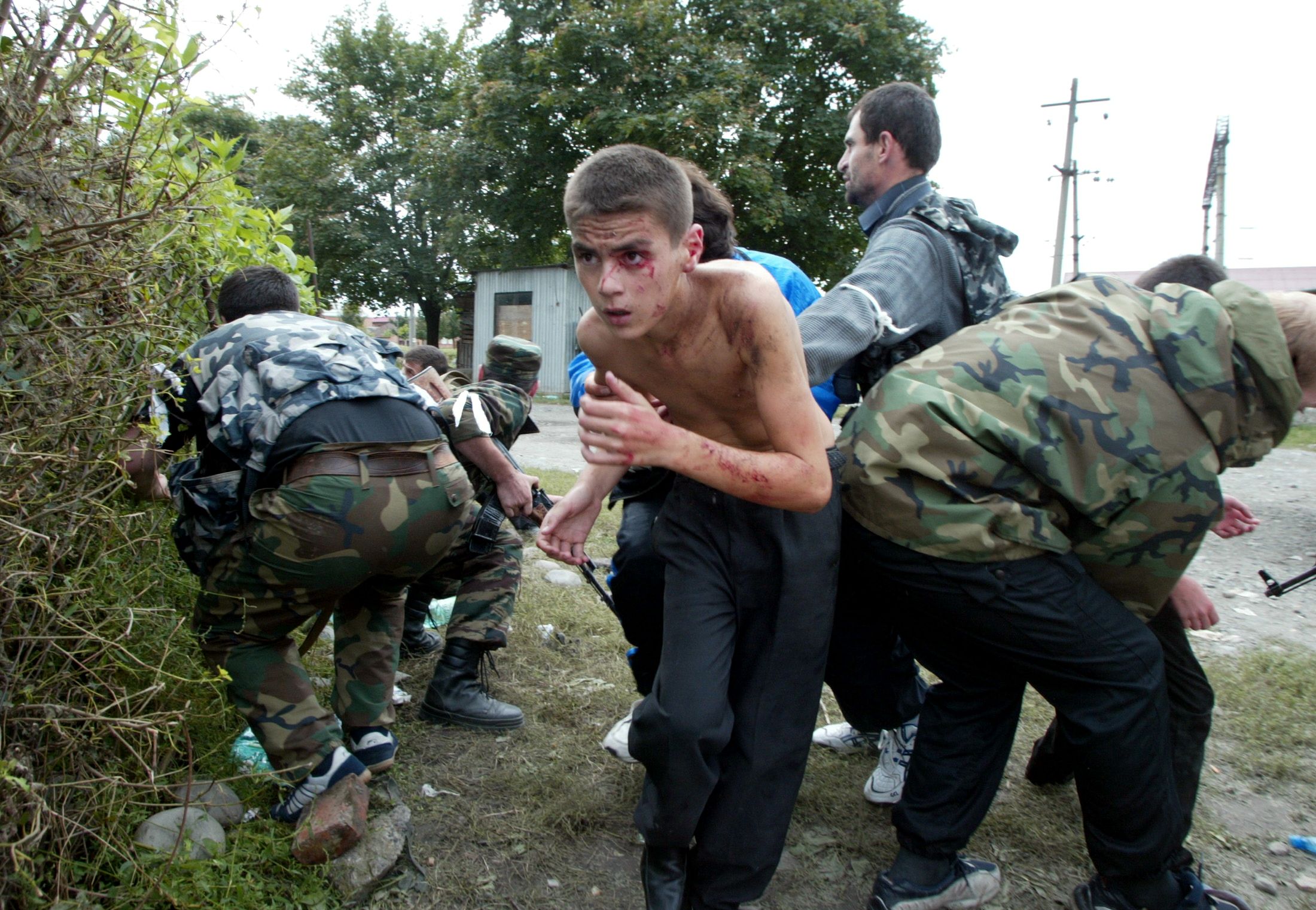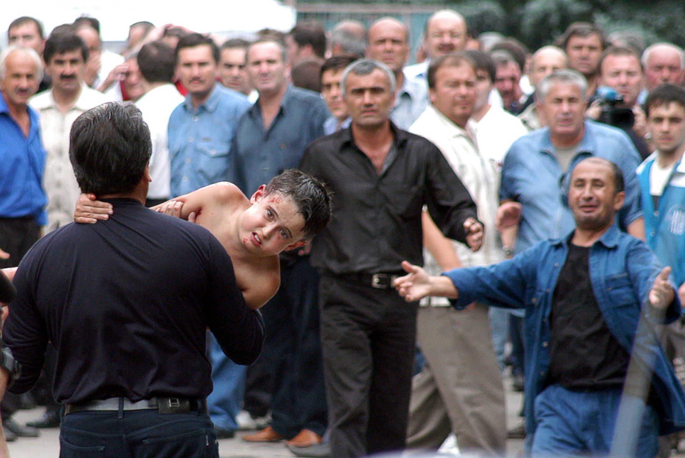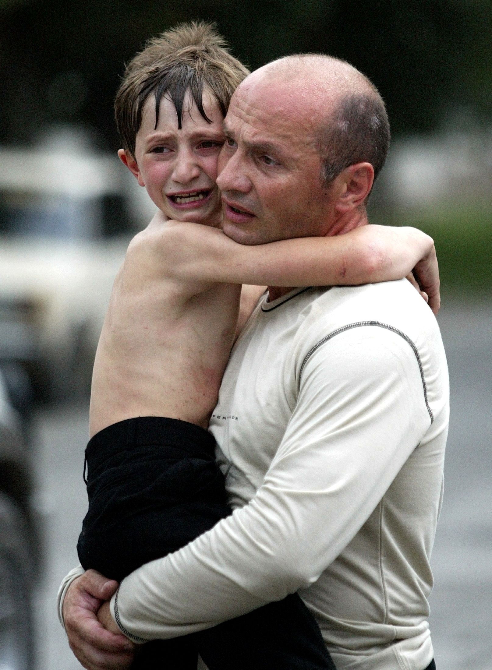 Спасательная операция в Беслане — гражданские волонтеры помогают эвакуировать заложников из захваченной школы.