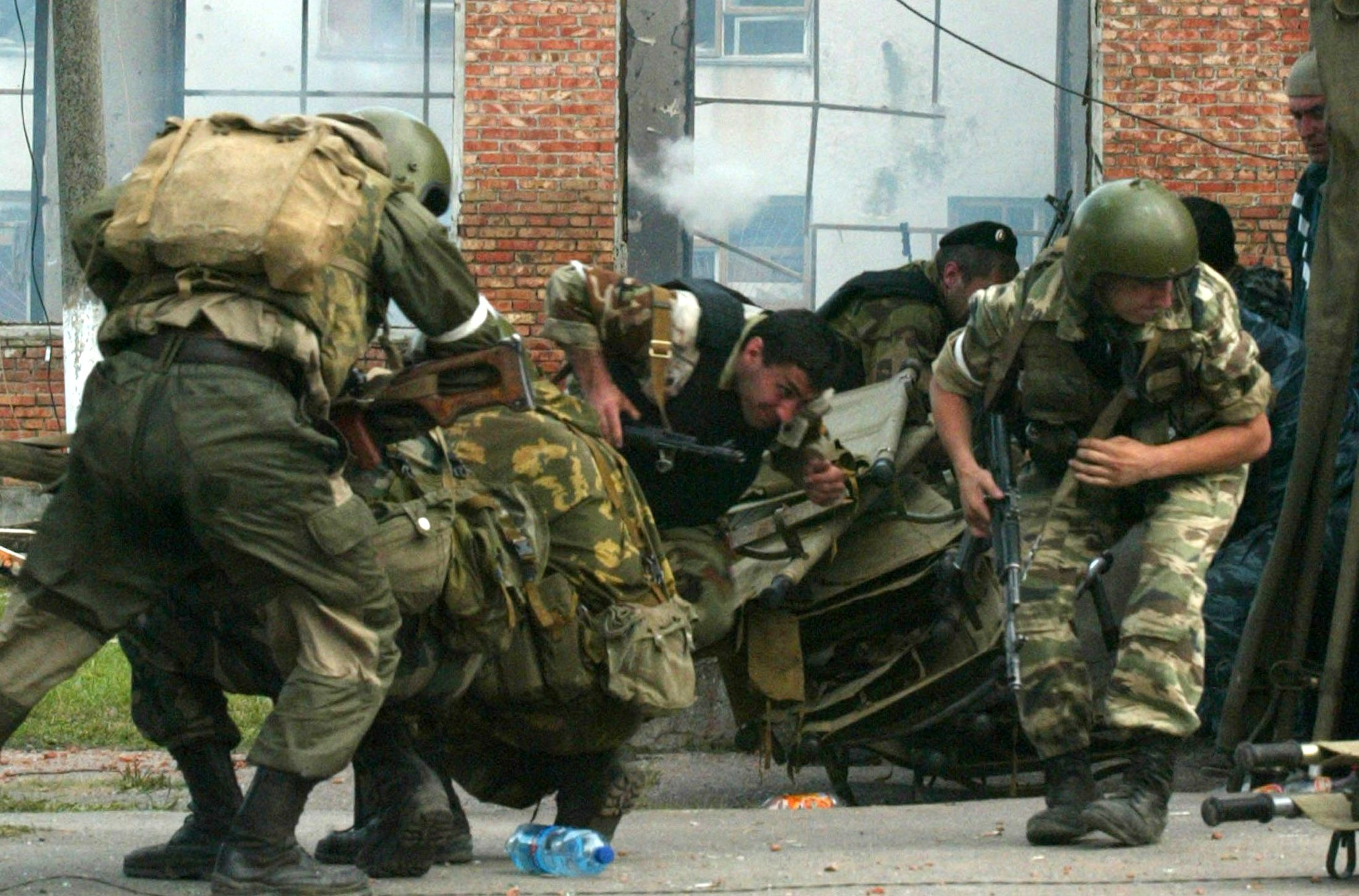 Солдаты оказывают первую помощь раненой заложнице, спасенной из плена.