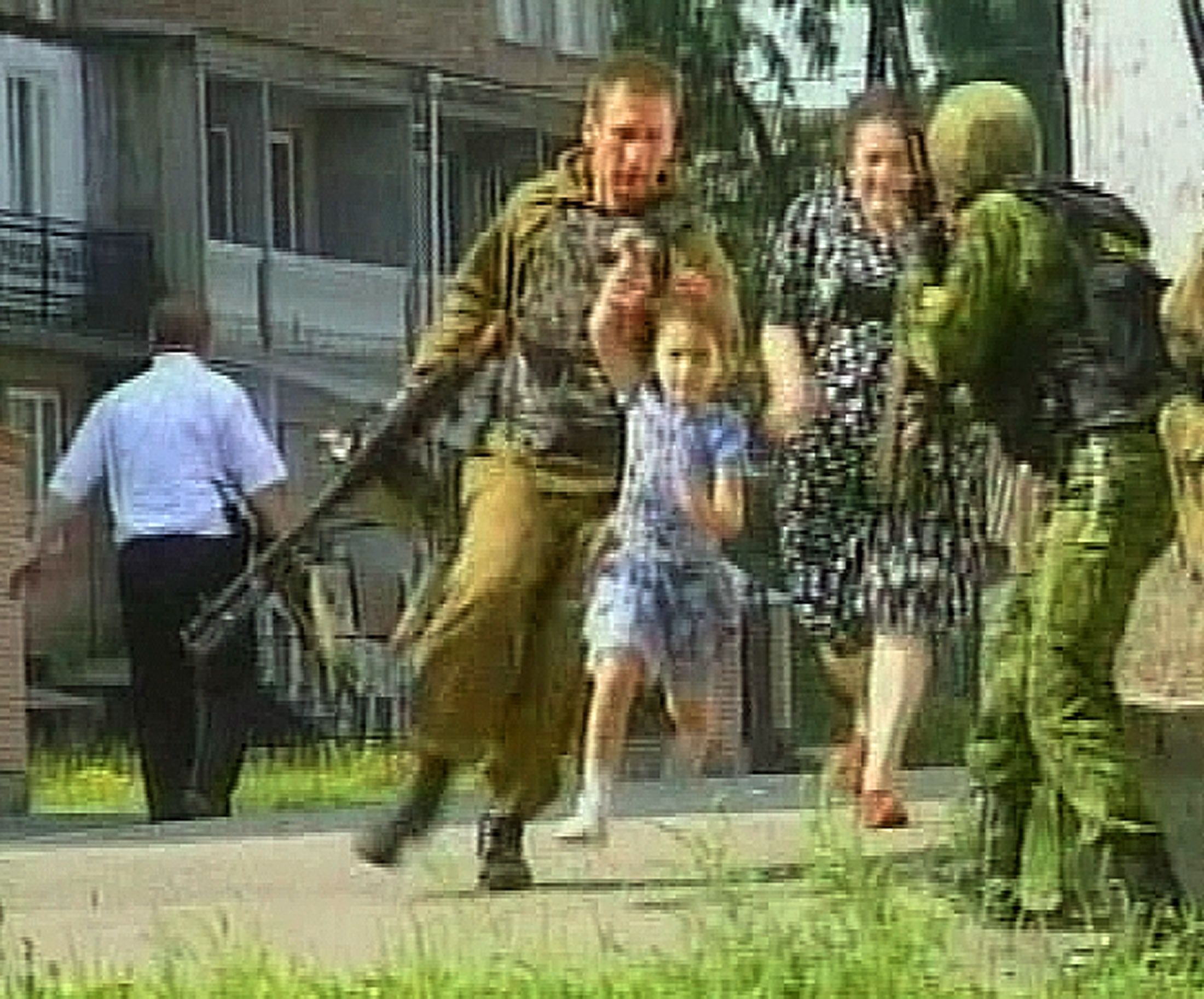 Один из террористов удерживает ногой спусковое устройство, с помощью которого приводится в действие бомба. Рядом с ним — 11-летний Георгий Фарниев, один из заложников. Он выжил при теракте.