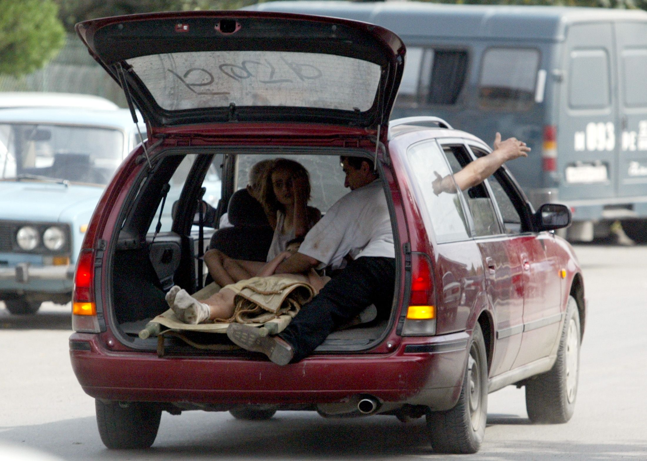 Руслан Аушев машет рукой жителям Беслана, собравшимся возле захваченной школы. В машине — ребенок, освобожденный после переговоров с террористами.