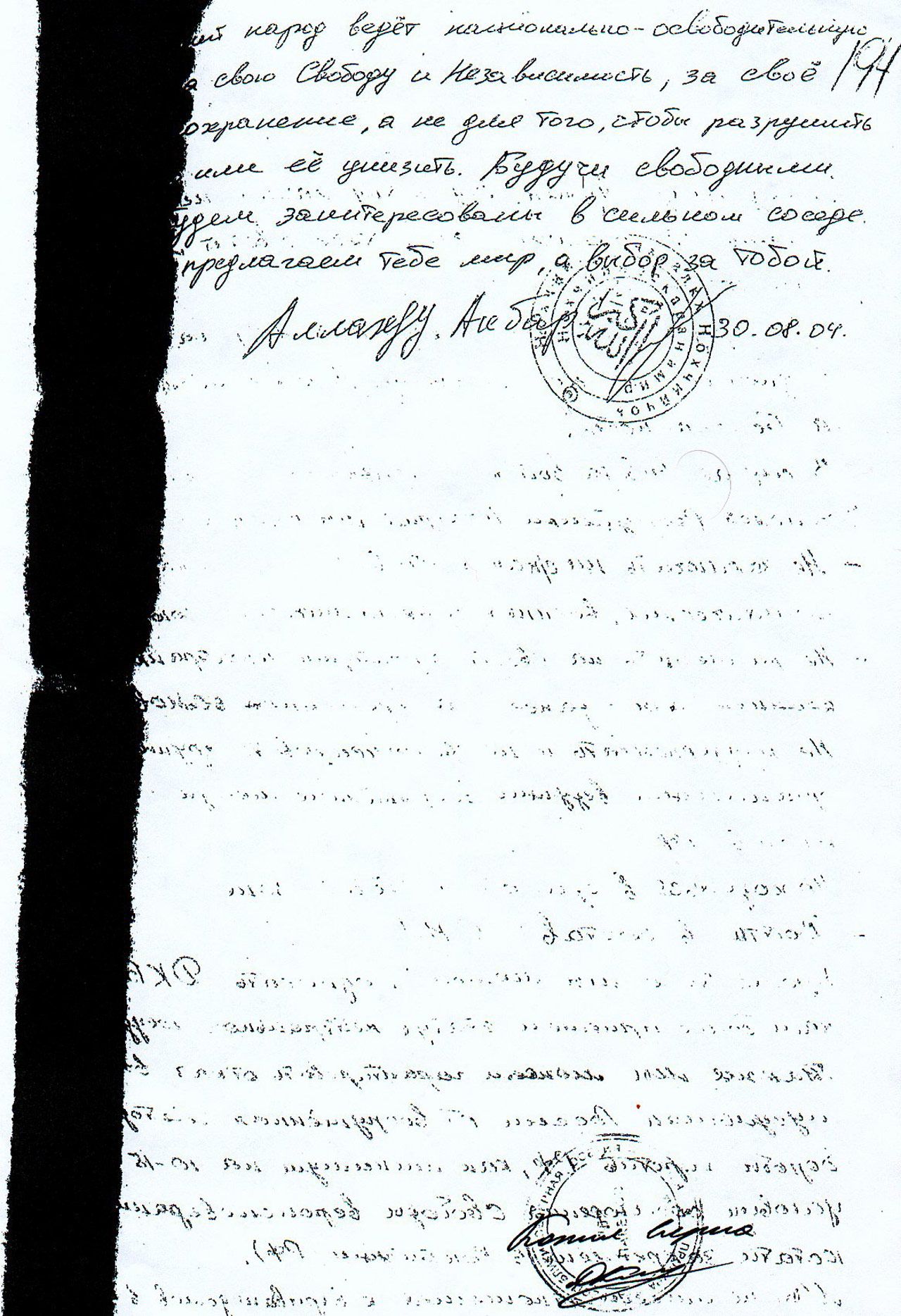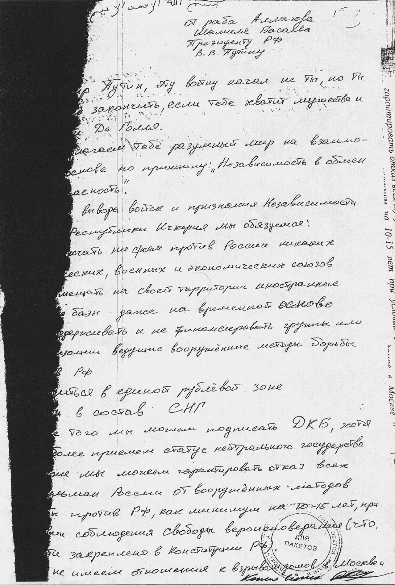 Текст записки, которую передали террористы с одной из заложниц в первые часы после захвата: «Мы требуем на переговоры президента республики Дзасохова, Зязикова, президента Ингушетии, Рашайло, дет врача. Если убьют любого из нас, расстреляем 50 человек. Если ранят любого из нас, убьем 20 человек. Если убьют из нас 5 человек, мы все взорвем. Если отключат свет, связь…». Текст на оборотной стороне листа: «… на минуту мы расстреляем 10 человек»