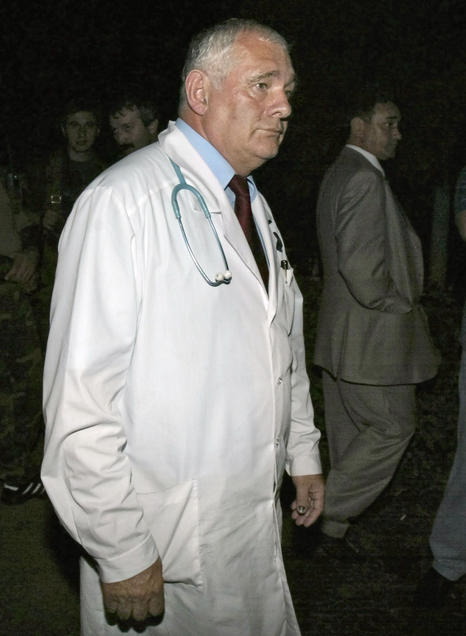 Руслан Аушев направляется в здание школы на переговоры с террористами. Бывший глава Ингушетии просил передать заложникам еду и воду. Террористы ответили ему отказом, заявив, что заложники держат добровольную сухую голодовку. Скриншот из телевизионной хроники