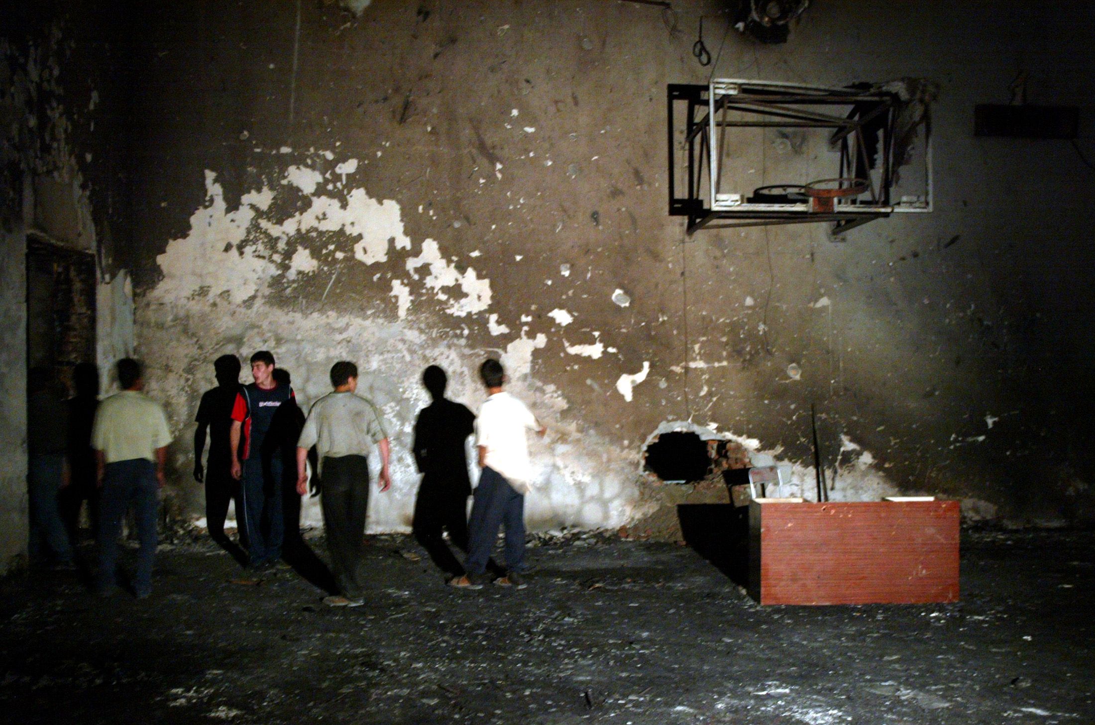 Террористы разложили взрывные устройства в спортзале на стульях у входа, а также на баскетбольных кольцах и двух троссах, натянутых между ними. Провода от бомб были подведены к замыкающим педалям, возле которых постоянно дежурили боевики.