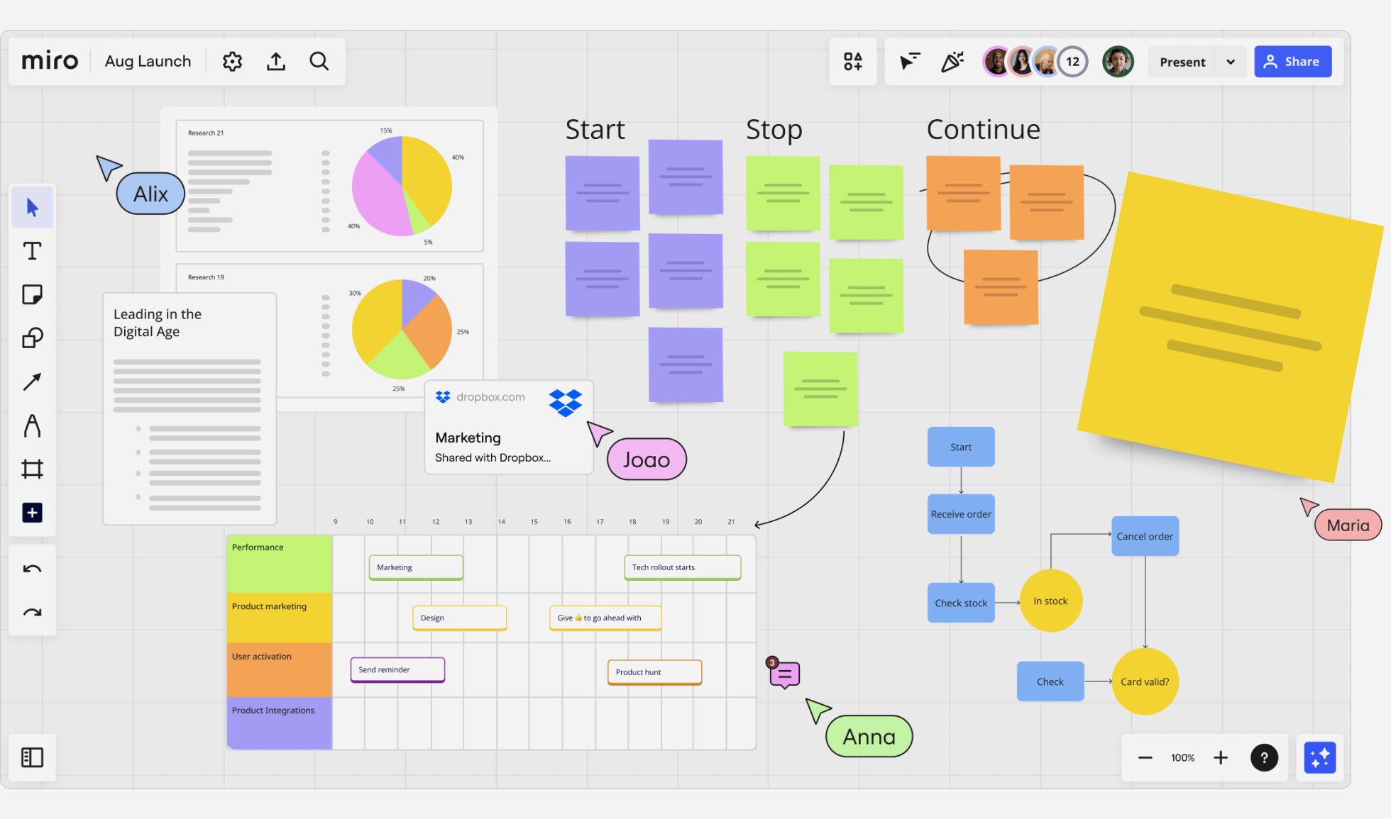В декабре 2022 года у владельцев устройств Apple появился собственный аналог Miro — приложение Freeform. В нем пользователи могут создавать собственные онлайн-доски, размещать на них текст, фигуры, заметки и любые медиафайлы, например видео. А у владельцев мобильных устройств есть еще и возможность рисовать пальцем или стилусом. Над одной доской могут работать до 100 участников. Интерфейс может показаться непривычным после Miro, но он довольно простой.