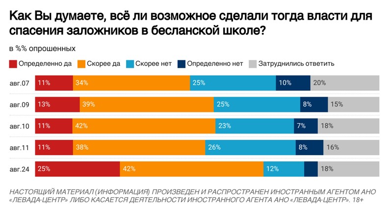 Лишь 16% опрошенных в 2024 году считают, что власти 20 лет назад в Беслане не сделали всего необходимого для спасения заложников, следует из результатов исследования «Левада-Центра». В 2011 году это мнение разделяли 34% россиян.