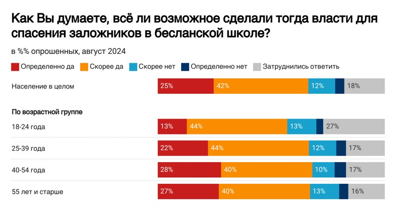 Мнение о том, что власти не сделали всего необходимого для спасения заложников, чаще разделяют опрошенные до 24 лет — 57%, респонденты со средним образованием и ниже — 63%, недовольные происходящим в стране — 49%, противники Путина — 38%, и те, кто доверяет информации из ютуб-каналов — 57%, сообщил «Левада-Центр».