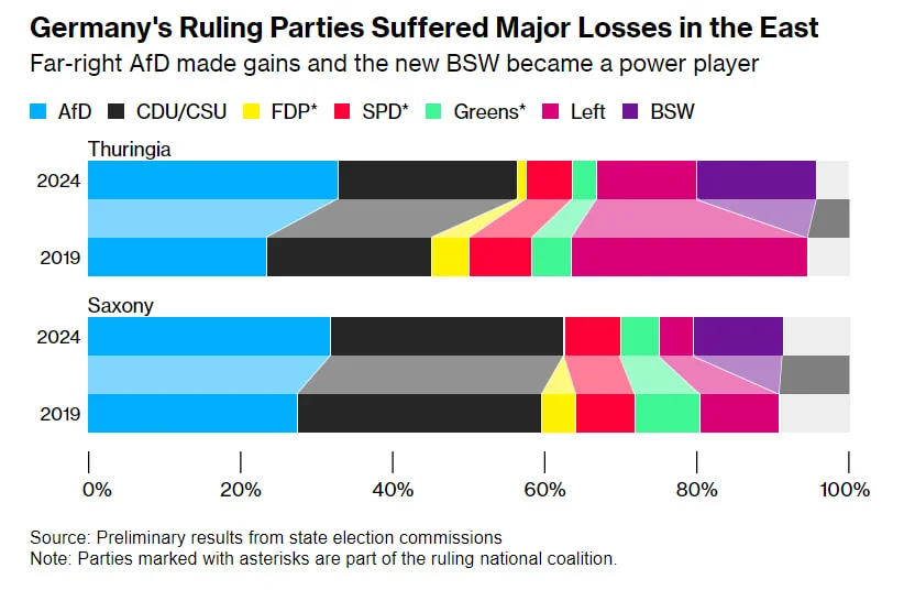 «Альтернатива для Германии» (AfD) стала первой ультраправой партией, победившей на выборах в региональный парламент Германии со времен Второй мировой войны. В Тюрингии она стала первой, в Саксонии — второй после христианских демократов. Все три партии, входящие в правящую коалицию на федеральном уровне, остались далеко позади.