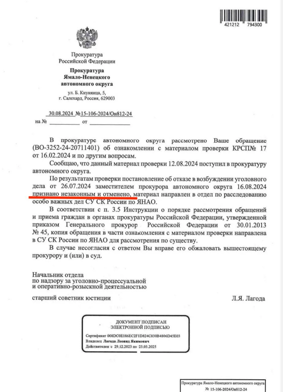 Прокуратура ЯНАО отменила решение СК не возбуждать уголовное дело по факту гибели политика Алексея Навального в колонии. Об этом говорится в ответе ведомства, документ опубликовал директор ФБК Иван Жданов.
