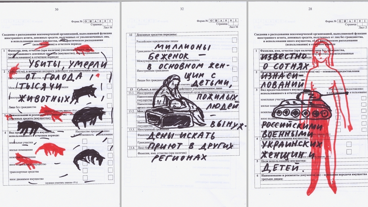 В самом первом "художественном" отчёте она уведомила Минюст о том, сколько на тот момент погибло мирных украинцев по вине России. Обратную связь художница получила: российские власти несколько раз выписывали ей штрафы.