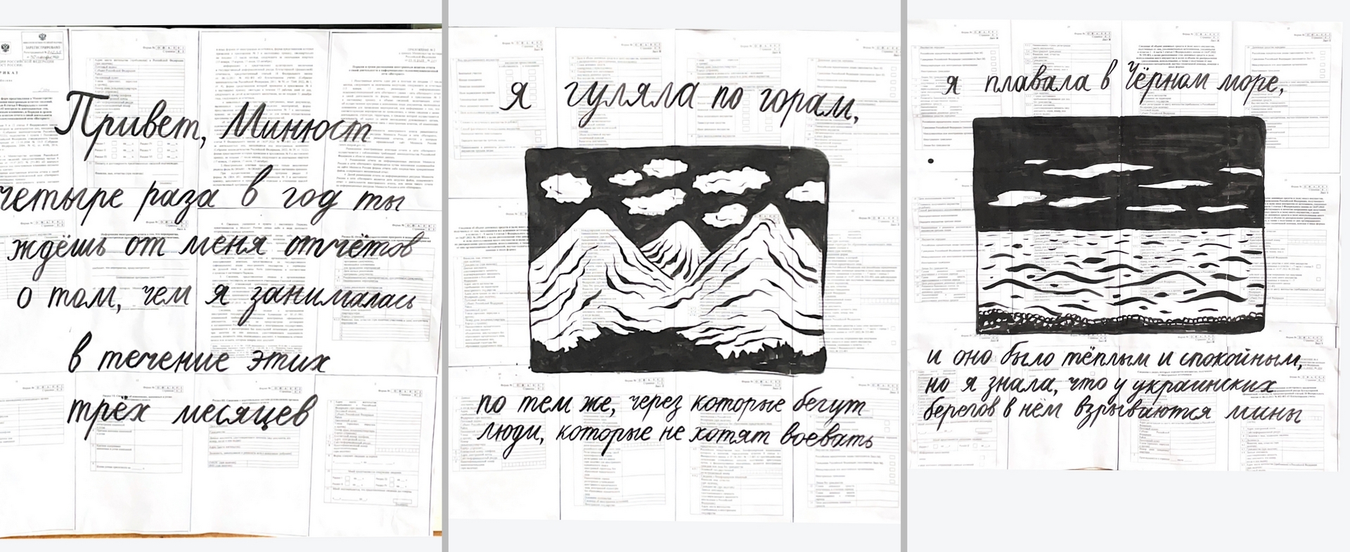 "Привет, Минюст! Четыре раза в год ты ждёшь от меня отчёт о том, чем я занималась в течение этих трёх месяцев. Я гуляла по горам. По тем же, через которые бегут люди, которые не хотят воевать. Я плавала в Чёрном море, и оно было тёплым и спокойным, но я знала, что у украинских берегов в нём взрываются мины. Я видела цветы, которые выросли во время войны, и это было прекрасно и страшно".