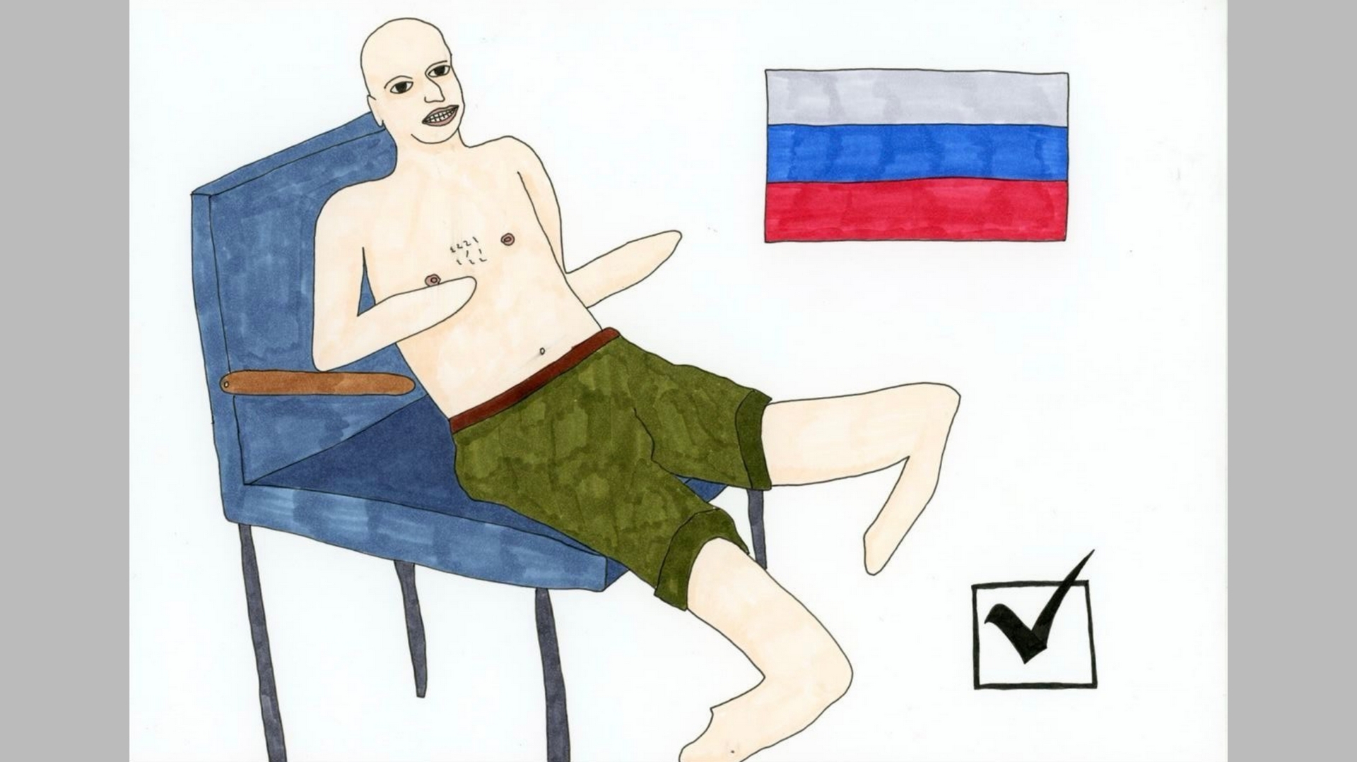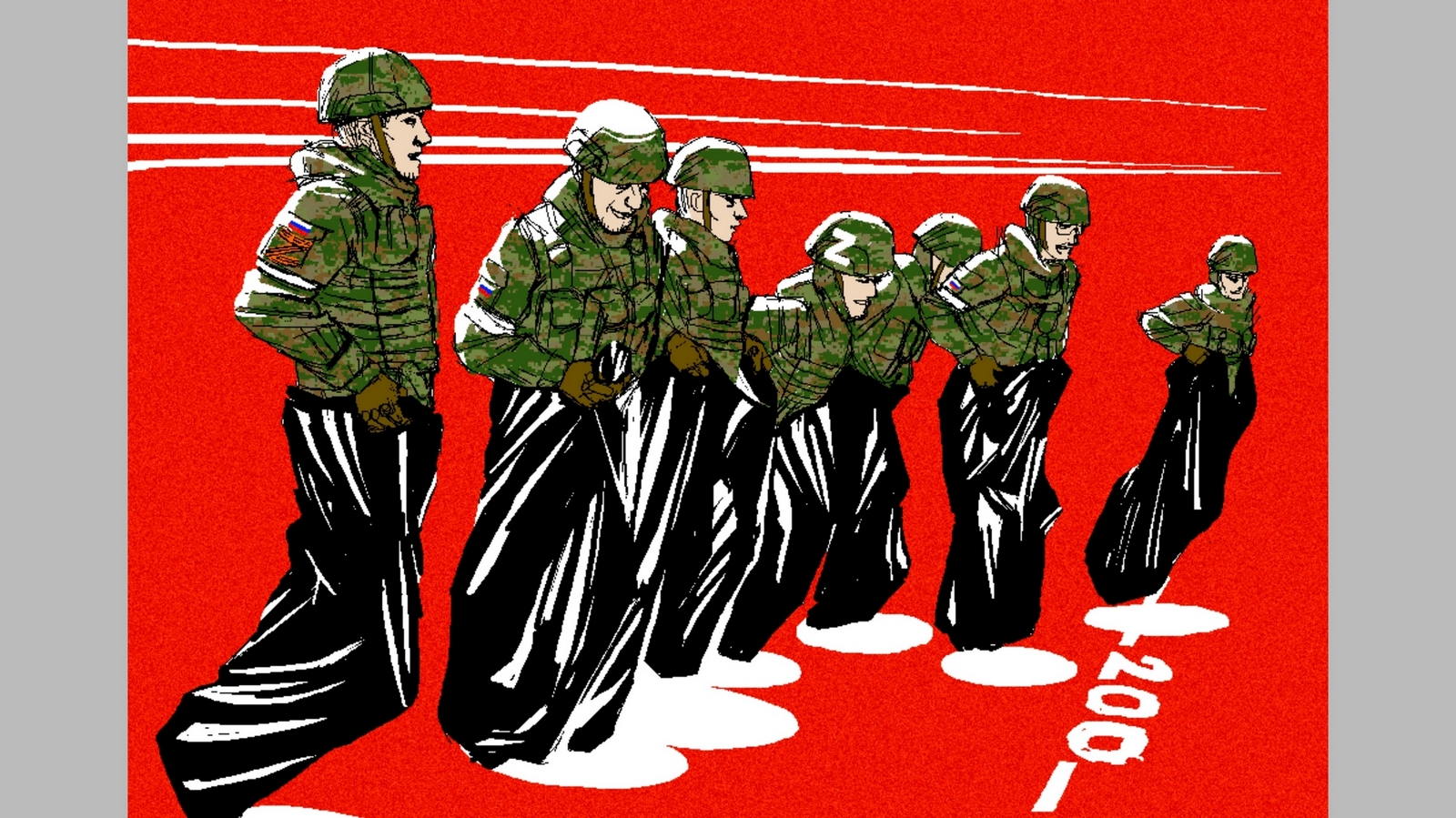 – Современная русская народная забава – это пойти и погибнуть за деньги. Какой-то новый смысл российского существования. Иллюстрация родилась на кураже. Смеяться не всегда уместно. Война – страшная трагедия. Но когда в сентябре 2022 года в России объявили мобилизацию, в Украине было принято над этим иронизировать, и я в каком-то смысле поддался настроению. Сейчас, в 2024 году, такую иллюстрацию не нарисовал бы. Я рисовал эти работы – с омоновцами, с русскими солдатами в мусорных мешках, – когда в начале войны горело чувство протеста. Сейчас уже хочется чего-то другого – окончания этой трагедии и какого-то разговора. Надоело ненавидеть и расчеловечивать. Мне надоела война, я устал. Думаю, эта усталость, апатия, депрессия чувствуется в моих последних работах, – говорит Алексей Ковальчук.