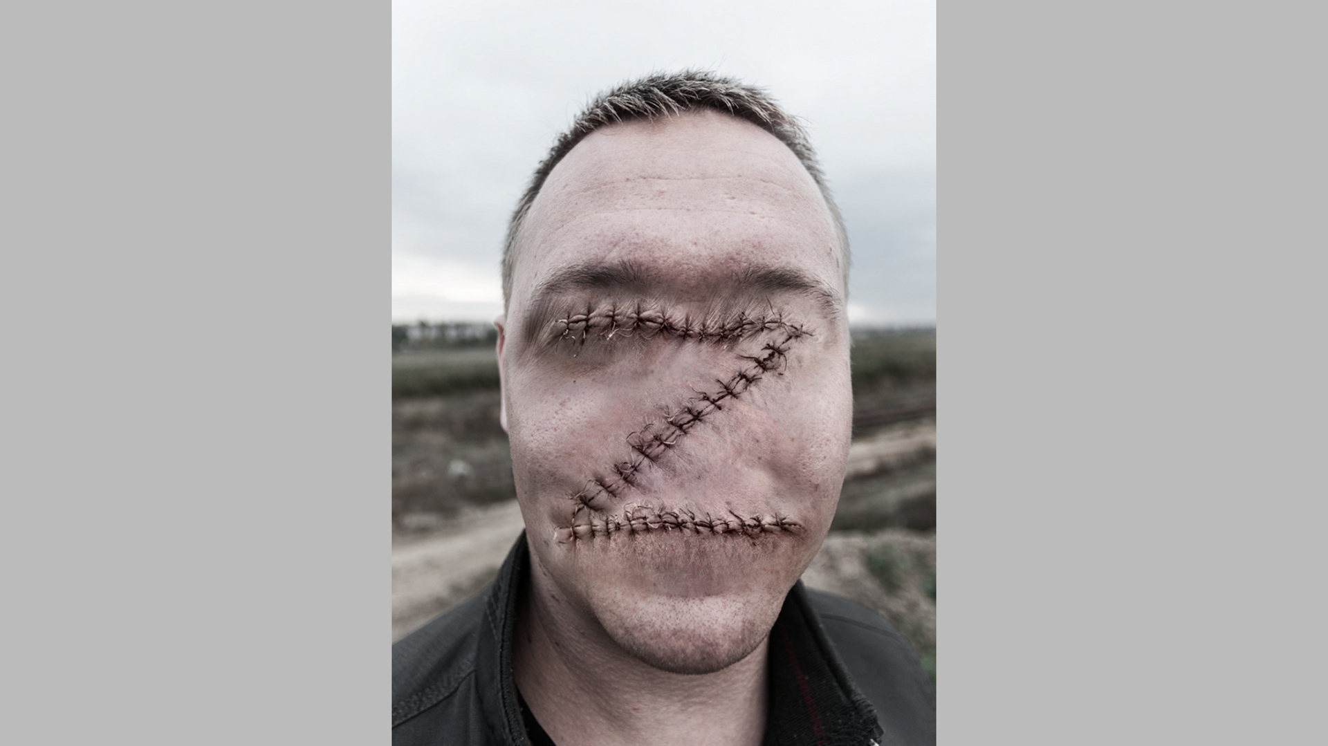 В коллективной выставке "Художники против Кремля" участвуют несколько украинцев. Херсонец Михаил Рей – автор одного из самых узнаваемых символов современного антивоенного искусства: человек без глаз и эмоций, у которого на лице Z-образный шов.