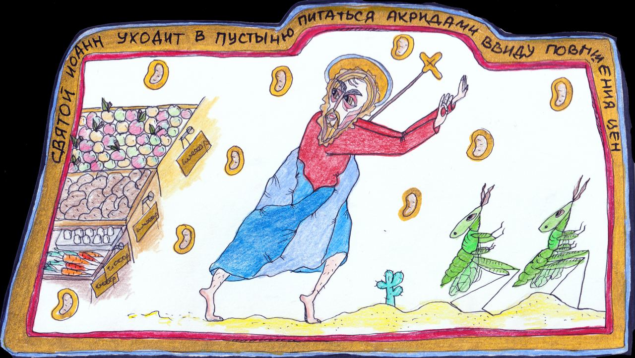 Она, кроме того, рисует сатирические иконы, посвящённые реалиям российской жизни.