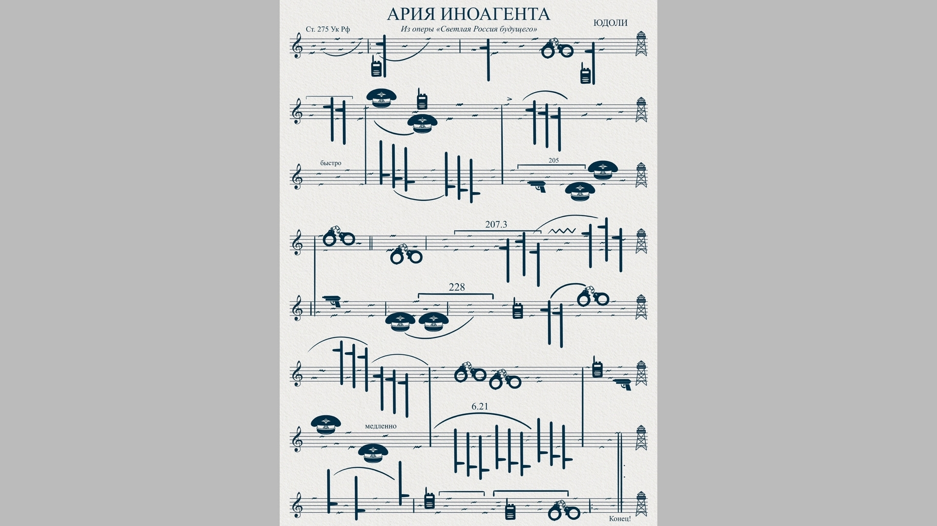 – Когда меня просят объяснить мои работы, всегда отвечаю, что должна быть какая-то недосказанность, чтобы зрители немного шевелили мозгами. Но, наверное, это про людей, которые в твиттере бесконечно вещают про какое-то абстрактное светлое будущее страны, не понимая, как это будущее может выглядеть. С другой стороны, это и про репрессии. Вместо нот наручники и дубинки. Если присмотреться, можно увидеть номера статей уголовного и административного кодексов, по которым чаще всего привлекают оппозиционеров, чтобы заставить их замолчать, – рассказывает Дмитрий.