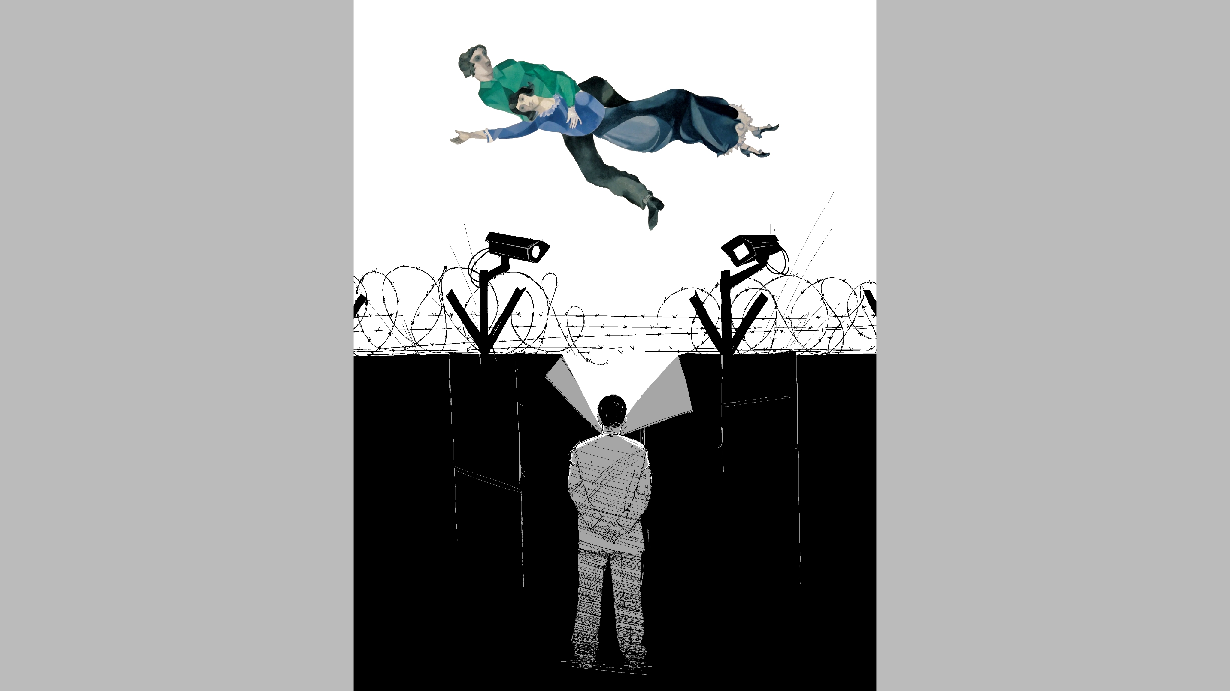 – "Свобода". Человек в робе смотрит за стену, за "железный занавес", и видит там "Летящих" Шагала. Полёт – один из символов свободы. Это я начал рефлексировать по поводу того, что сижу в запертой стране. Жил в двух странах СНГ и так и не узнал, что такое свобода. Сейчас сижу за этой "Берлинской стеной", в государстве, где тотальная цензура. Цензура по понятным причинам: здесь война, на Украину напала Россия. Но я понял, что меня это всё уже задушило, – говорит Алексей Ковальчук.