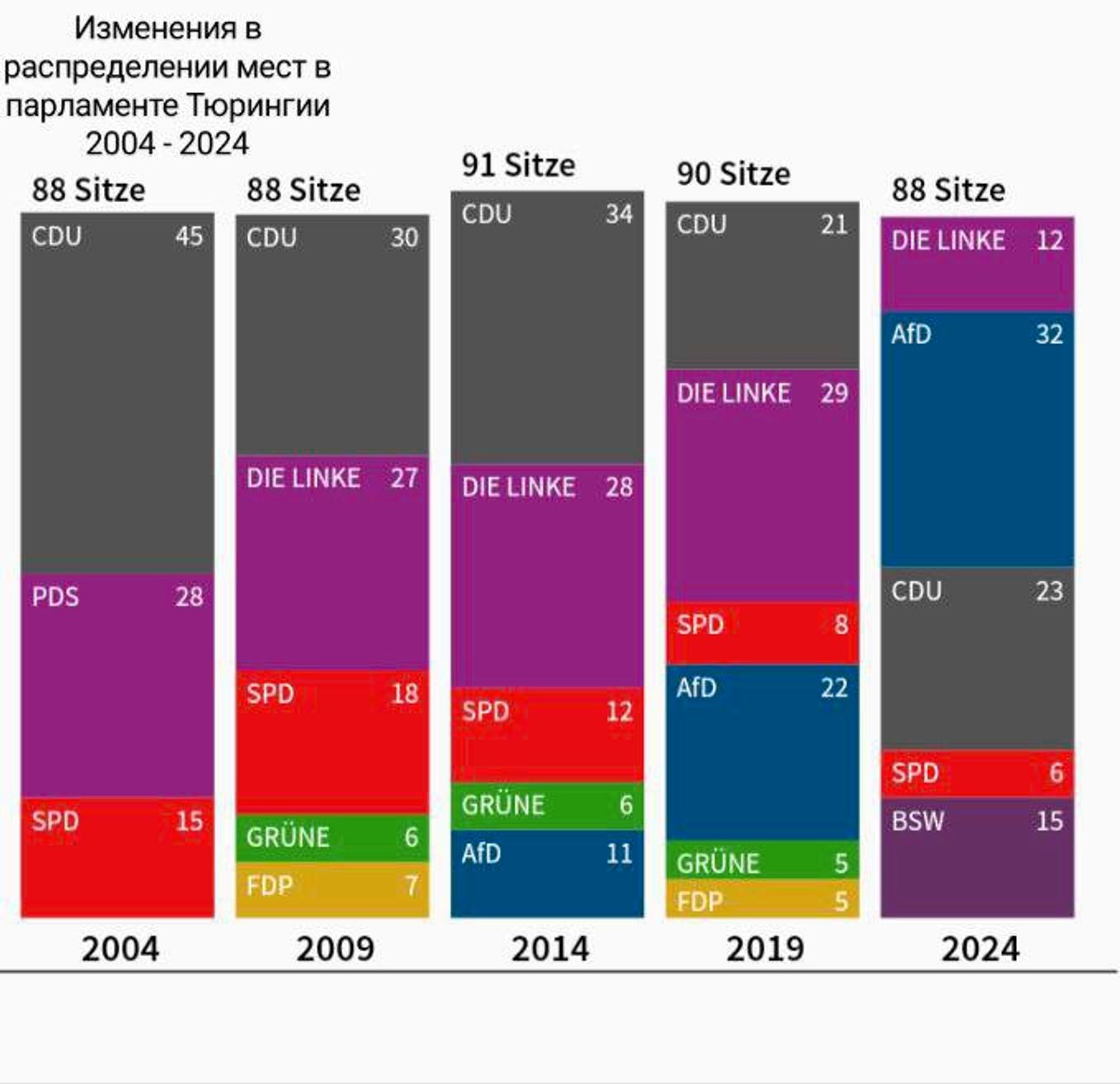 Небольшая экономически депрессивная земля с населением в 2 млн человек на юге бывшей ГДР стала центром внимания всей Германии. На региональных выборах первое место заняла правопопулистская, выступающая за восстановление отношений с Россией и отмену помощи Украине партия «Альтернатива для Германии» (32,8%). Второе место — у главной сейчас «традиционной» оппозиционной правой партии ХДС (23,6%). На третьем — новичок этих выборов, «Союз Сары Вагенкнехт — здравый смысл и справедливость» (15,8%), выросший из пророссийского крыла Левой партии.