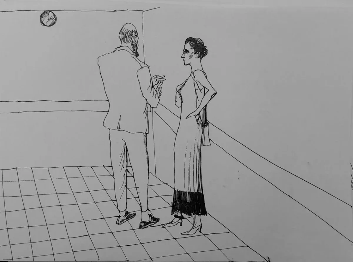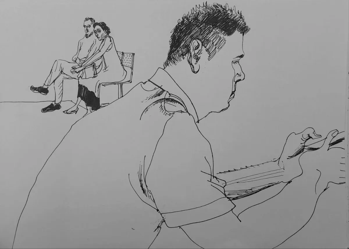 Рядом со мной сидит молодой человек с кожаным черным портфелем. Только спустя полтора часа ожидания я начинаю думать: а вдруг мой сосед и есть свидетель, — и решаю его нарисовать.