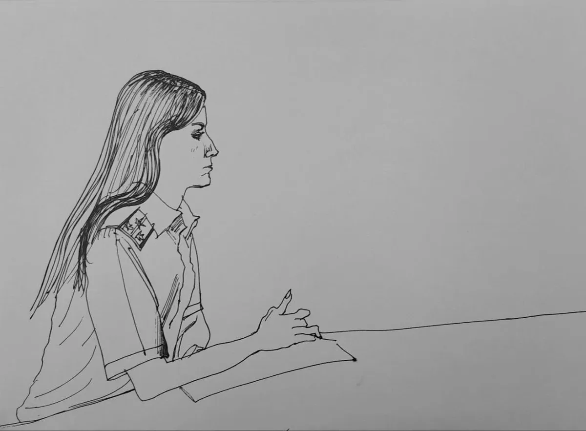 Судья Александра Лашина заходит в зал после того, как появляется Каменская — адвокат застройщика. Вызывают свидетеля со стороны обвинения Виктора Гусарова — это и правда тот самый молодой человек, которого я успела зарисовать в коридоре. Дальше я и слушатели видим его только со спины, и он из положения вполоборота общается со стороной обвинения и стороной защиты.