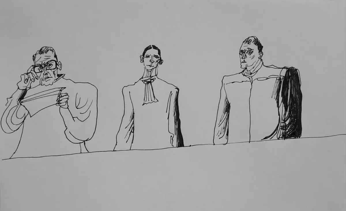 Суды по делам Дмитрия Иванова, автора канала «Протестный МГУ», и московского мундепа Кетеван Хараидзе — глазами художника