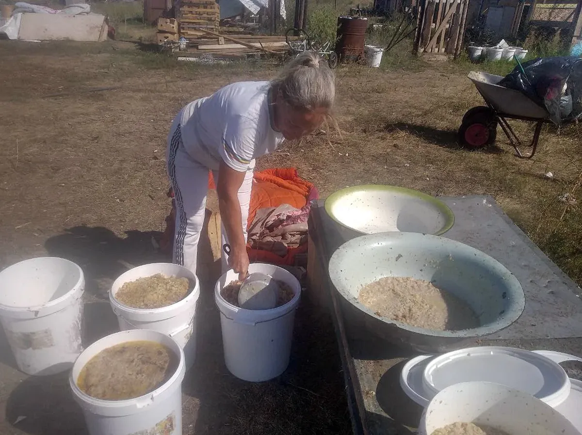 На раздаточной площадке стоят белые пластиковые ведра с кашей. Хозяйка гордо снимает крышку: «Если бы мне в больнице, когда я лежала, давали такую кашу, я бы сказала: о, у нас действительно великая страна!»