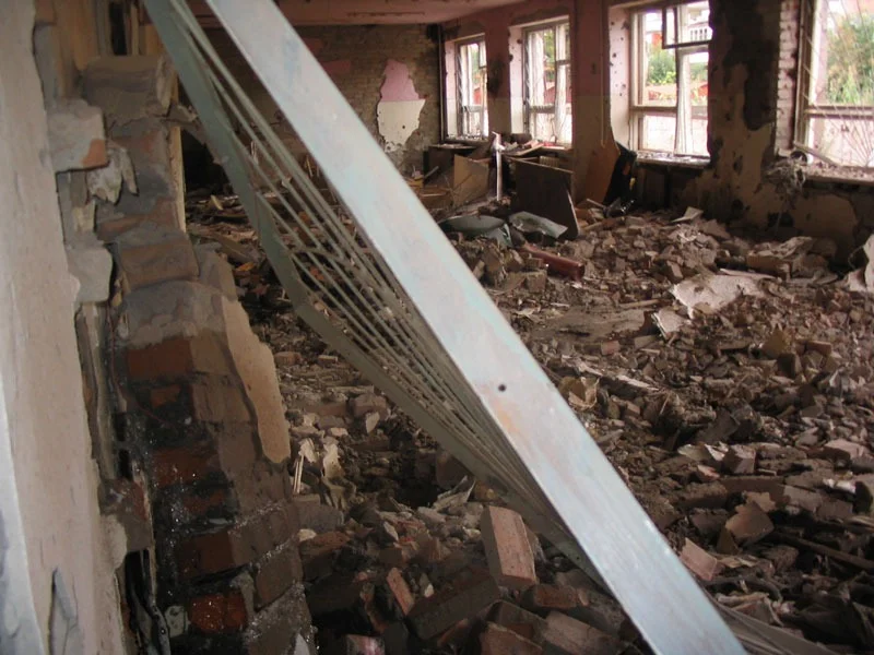Что важно, уже 4 сентября в ходе осмотра школы следователи действительно обнаружили оконные решетки внутри помещения столовой (см. фото). Кроме того, этим же осмотром было зафиксировано большое количество характерных разрушений внутренних стен, перекрытий и потолка столовой и примыкающих к ней подсобных помещений, которые не могли произойти от применения огнестрельного оружия и разрыва гранат. Это были фундаментальные разрушения внутреннего каркаса школы, и они могли образоваться только в результате применения гораздо более серьезного вооружения.